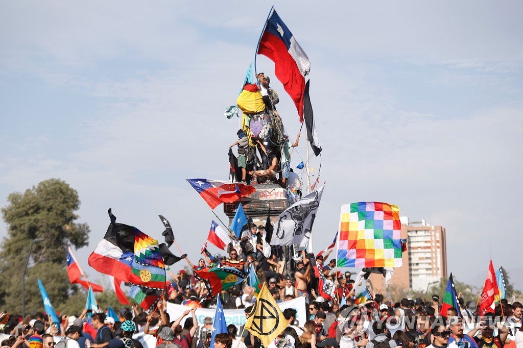 시위대가 시위 구호나 페인트로 덮인 동상 위로 올라가 깃발을 흔드는 모습은 칠레 시위의 상징과도 같은 장면이 됐다.