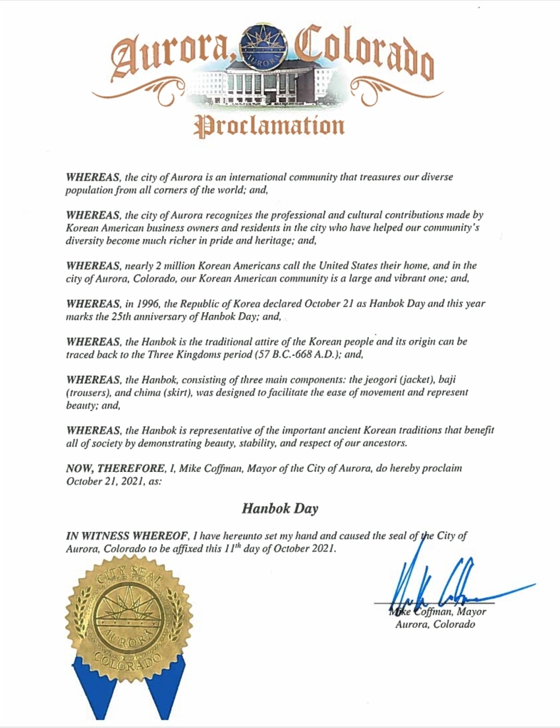 | ▲ 한복의 날 선언문 (뉴욕=연합뉴스) 고일환 특파원 = 미국 콜로라도주 오로라시의 한복의 날 선언문 2021.10.23. [민주평통 덴버협의회 제공.재판매 및 DB 금지] |