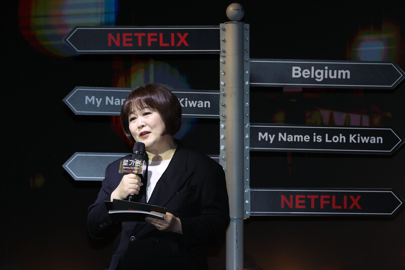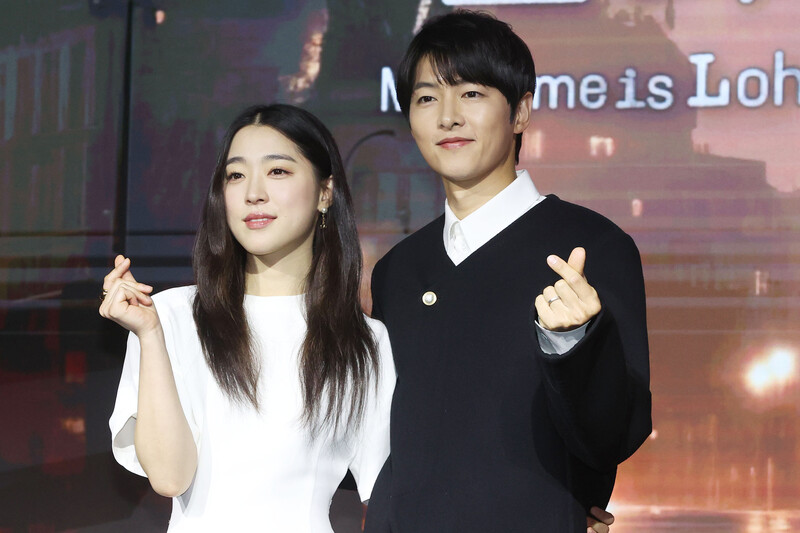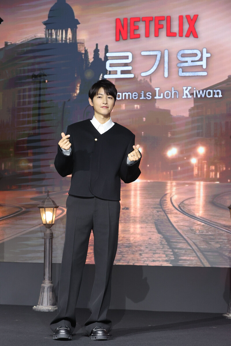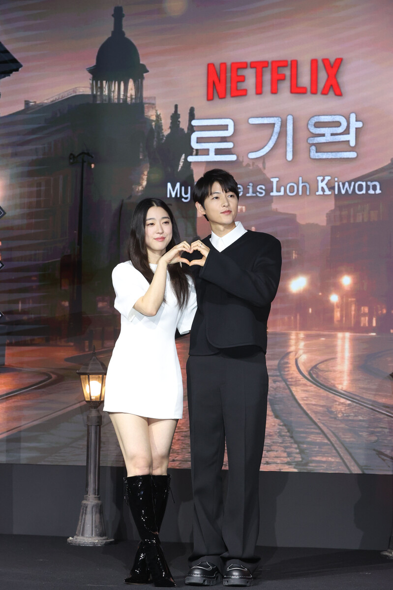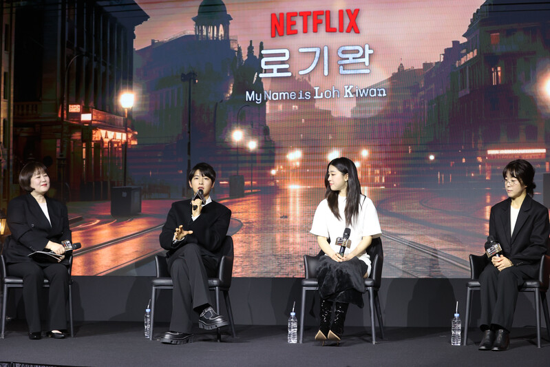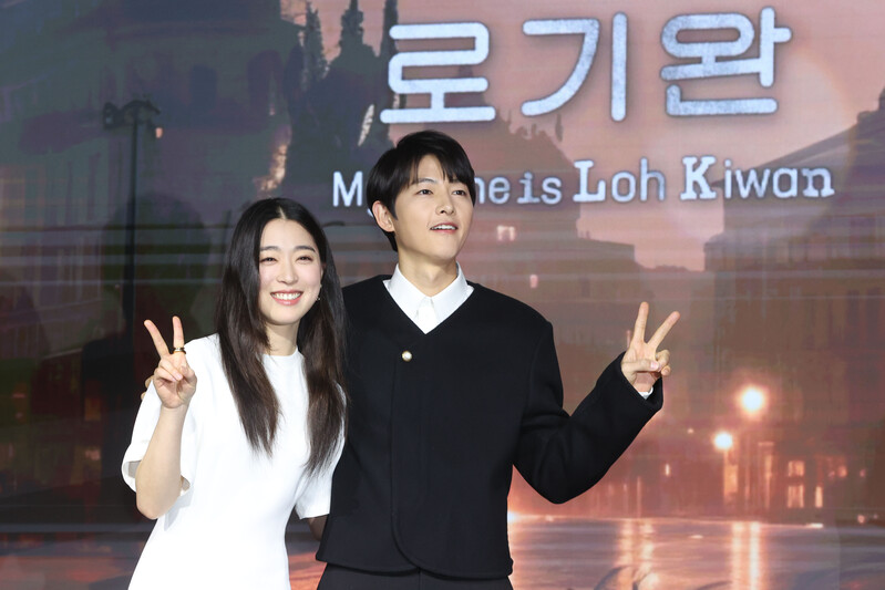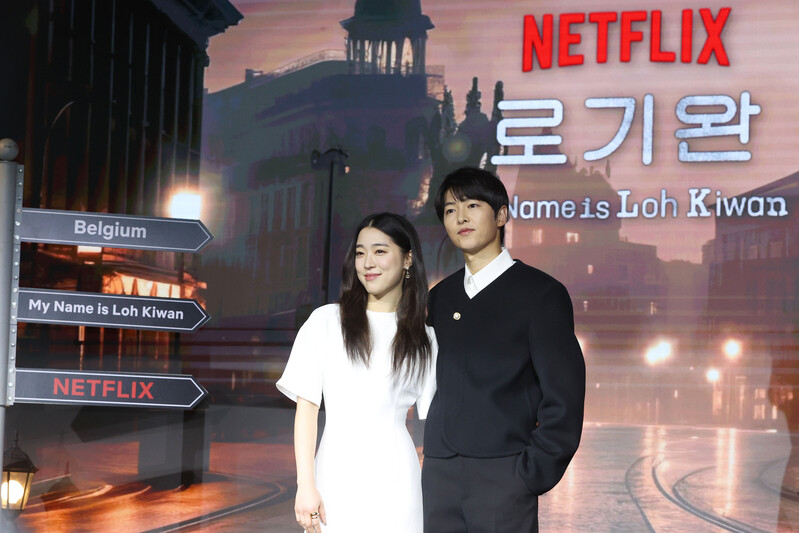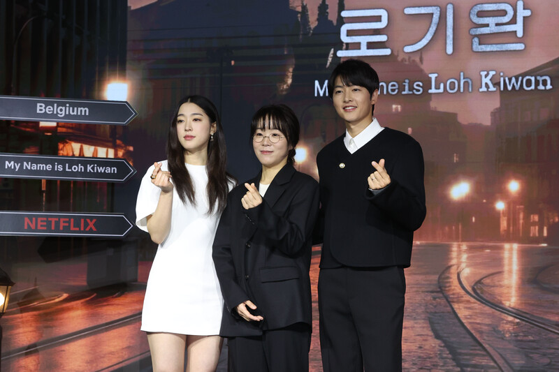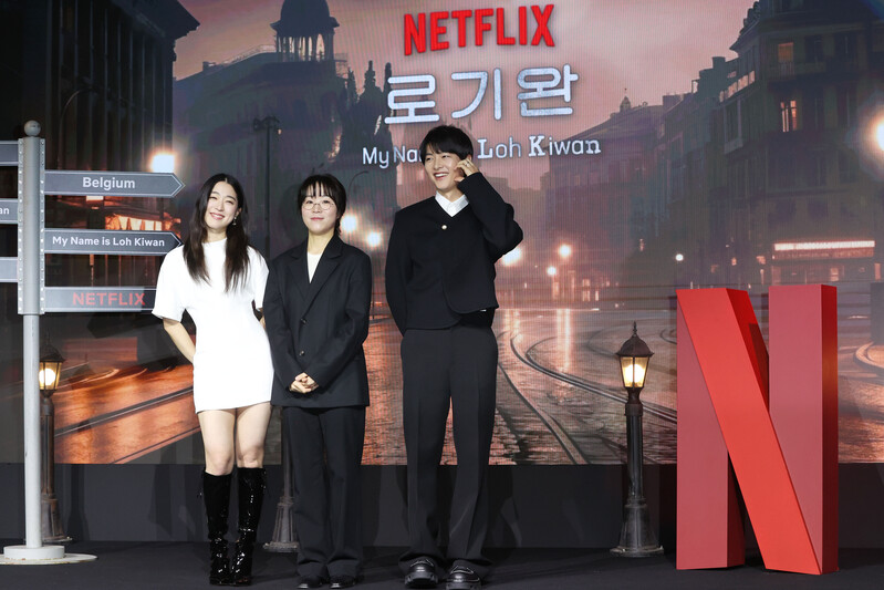 The stars of new movie "My Name is Loh Kiwan" an original series by Netflix -- Choi Sung-eun and Song Joong-ki along with director Kim Hee-jin are posing for various photos during a publicity event in Seoul on Feb. 27, 2024. (Yonhap)