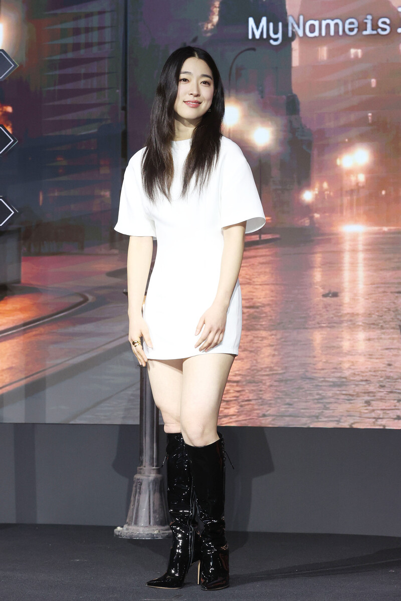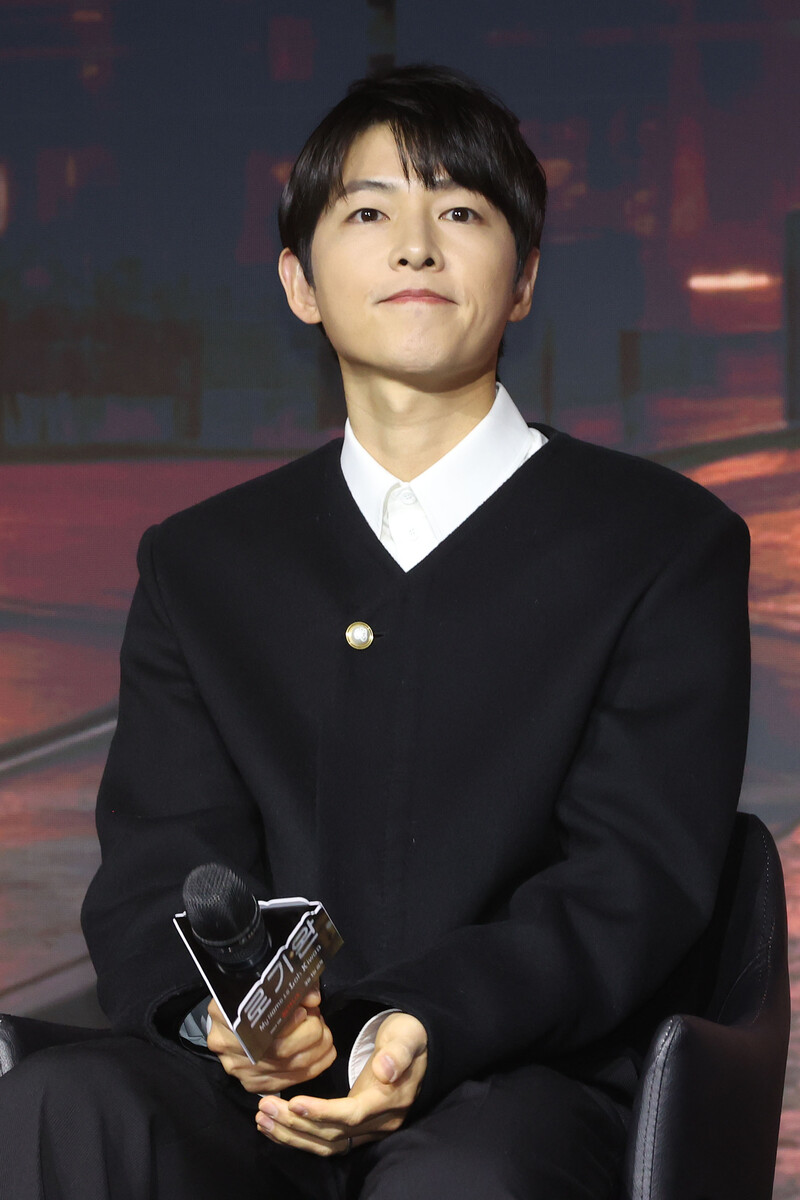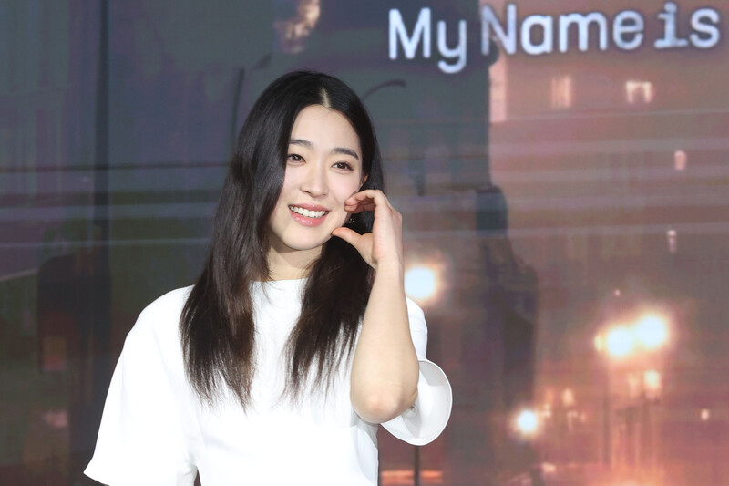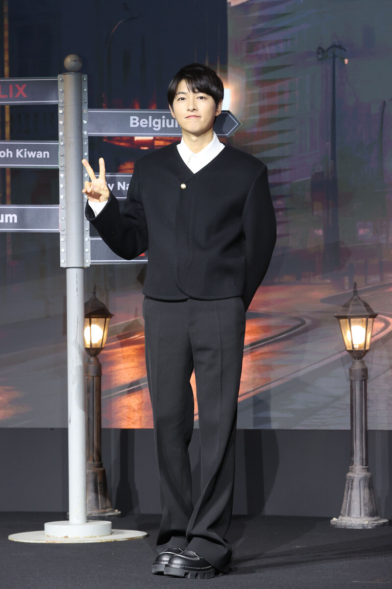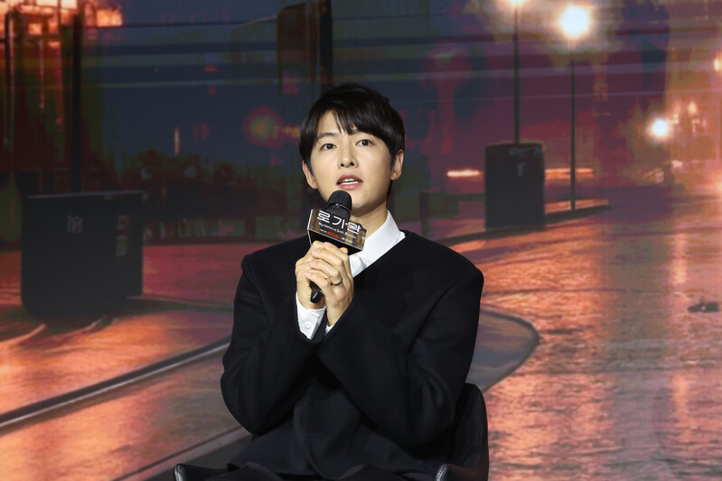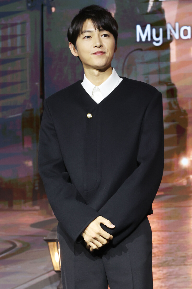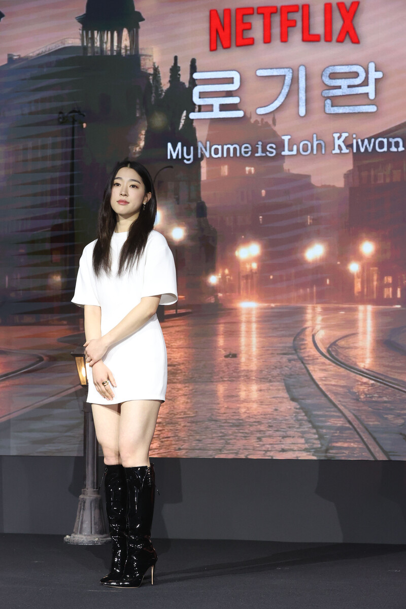 The stars of new movie "My Name is Loh Kiwan" an original series by Netflix -- Choi Sung-eun and Song Joong-ki along with director Kim Hee-jin are posing for various photos during a publicity event in Seoul on Feb. 27, 2024. (Yonhap)