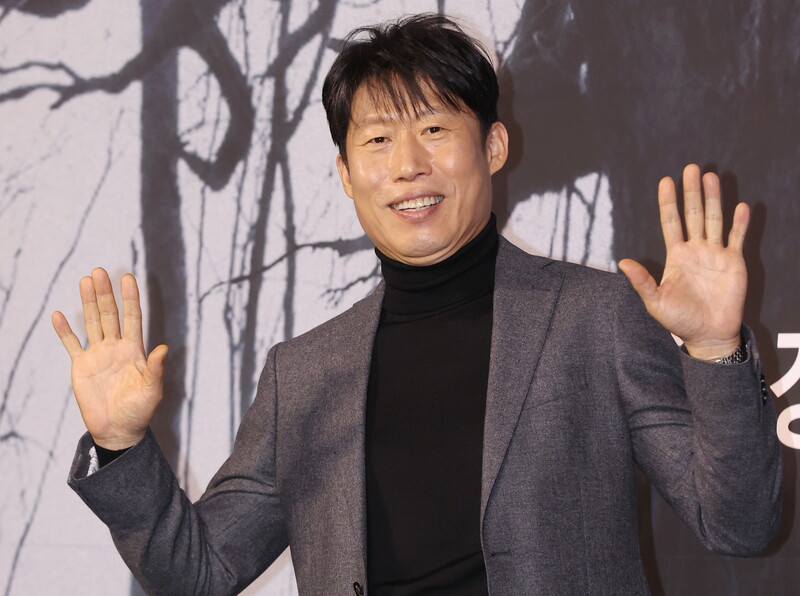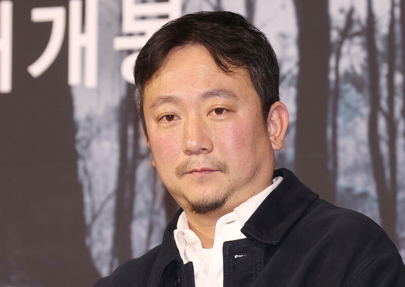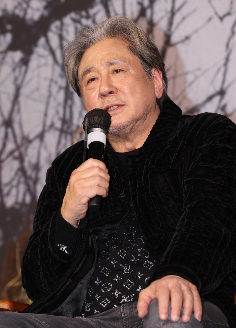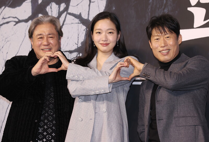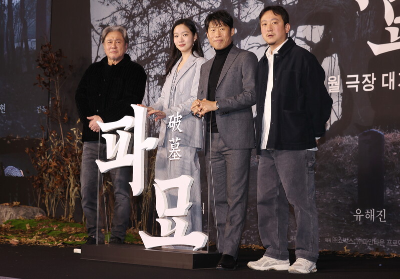 The stars of the new movie "Exhuma" Choi Min-sik, Kim Go-eun and Yoo Hae-jin along with director Jang Jae-hyun, attend a publicity event in Seoul on Jan. 17, 2024. The movie will be released in South Korea in February.