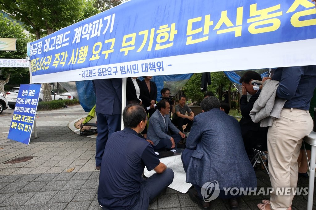 | ▲ 레고랜드 중단요구 단식농성 (춘천=연합뉴스) 자유한국당(현 국민의힘) 소속 강원도의원들이 2019년 7월 25일 오후 도청 앞 소공원에서 레고랜드 중단을 요구하며 단식농성을 하는 시민사회단체 관계자들을 만나 이야기를 나누고 있다. [연합뉴스 자료사진] |