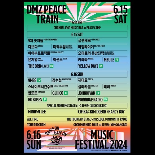 The "DMZ Peace Train Music Festival" in Goseokjeong, Cheorwon County, Gangwon Province, offers a unique experience that includes both music performances and a DMZ tour. This year's lineup features 24 artists representing various genres, including rapper E Sens, indie band Uhuhboo Project (featuring actor Baek Hyun-jin), and band Cacophony, which bases its sound on African music jams.