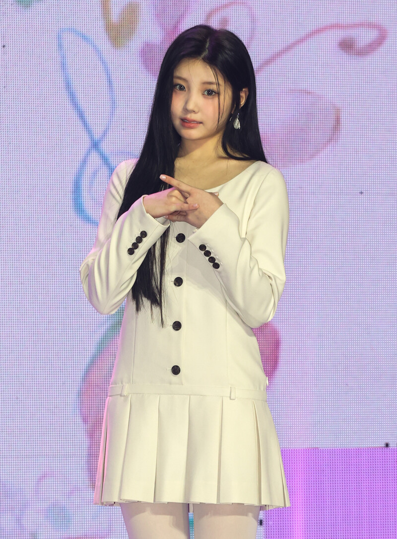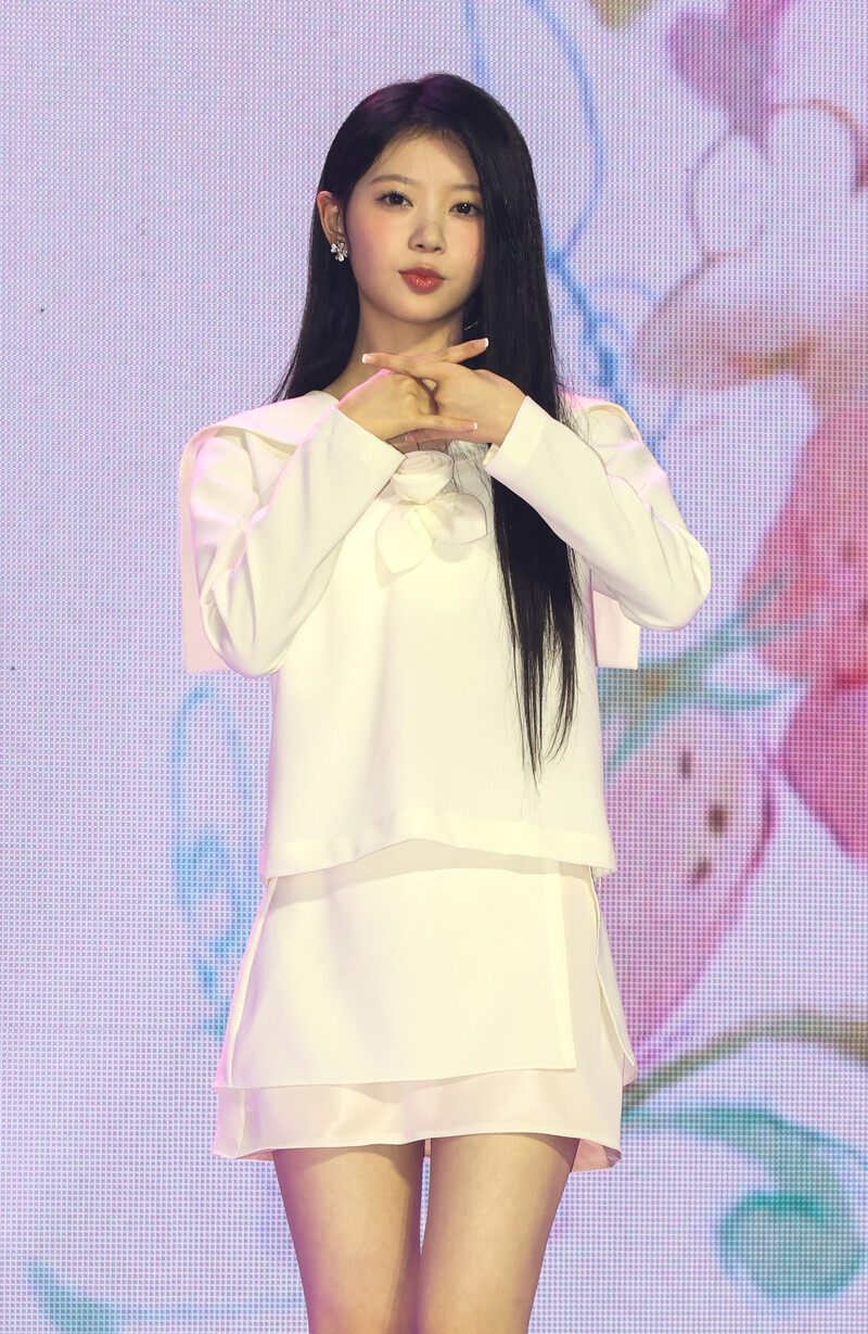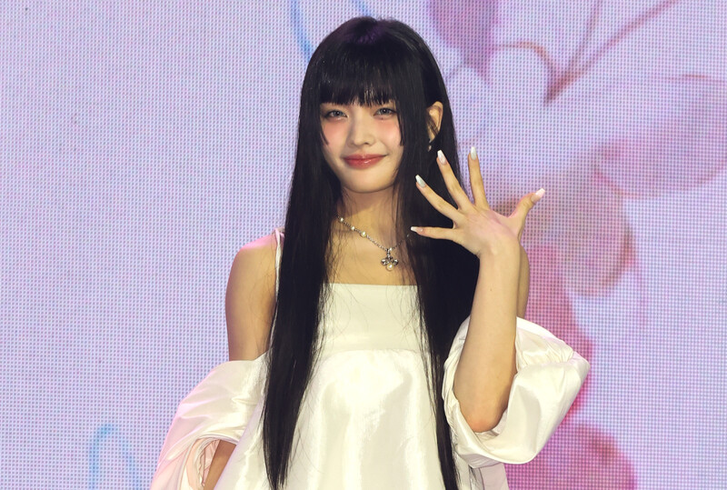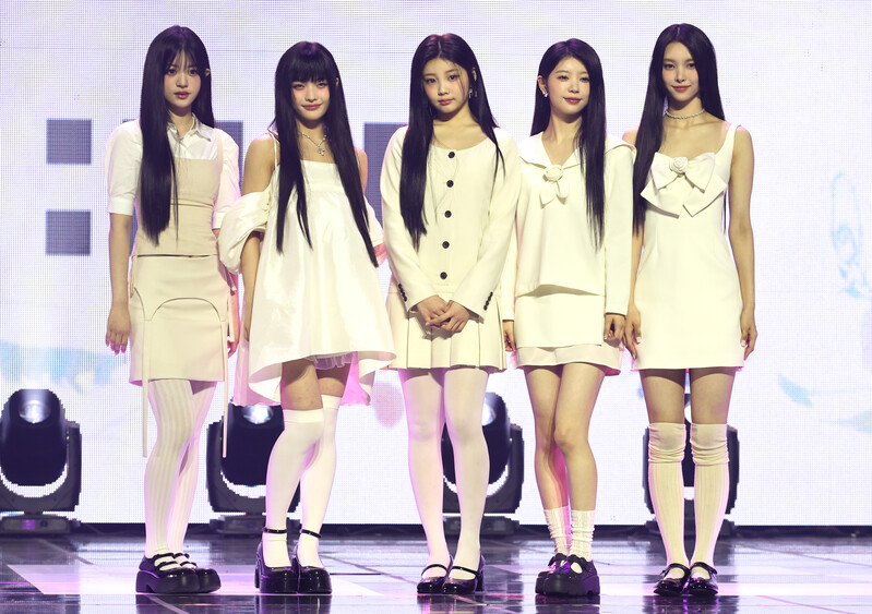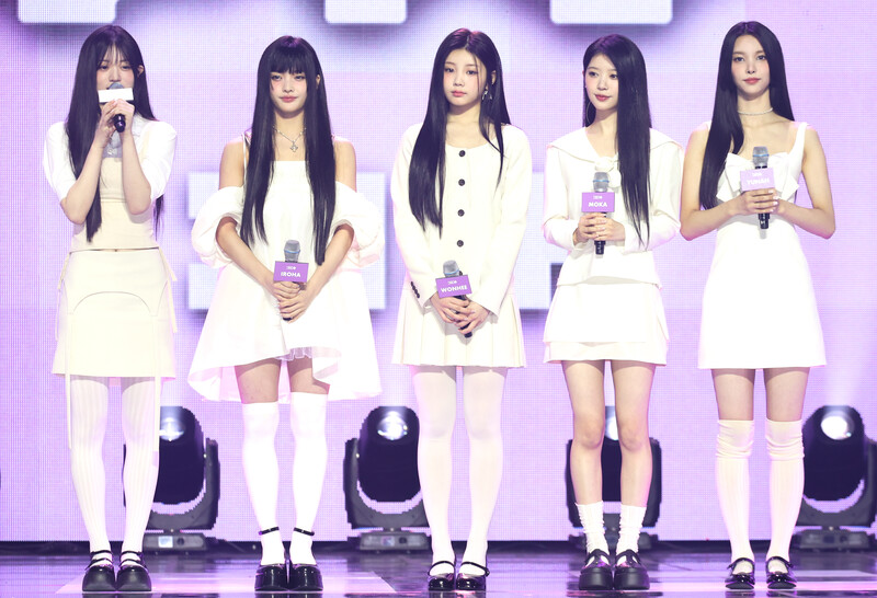 Members of South Korean girl group ILLIT poses for individual and group photos during a Media showcase for the group's debut mini album "Super Real Me" with title song "Magnetic" in Seoul on March 25, 2024.