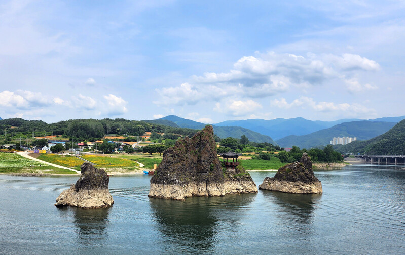 | ▲ 단양 팔경 중 '도담삼봉‘. 단양읍 도담리에 있는 남한강 수면을 뚫고 솟은 세 봉우리다. "Dodamsambong," one of Danyang's eight scenic spots, consists of three peaks that rise above the Namhangang River in Danyang-eup. |