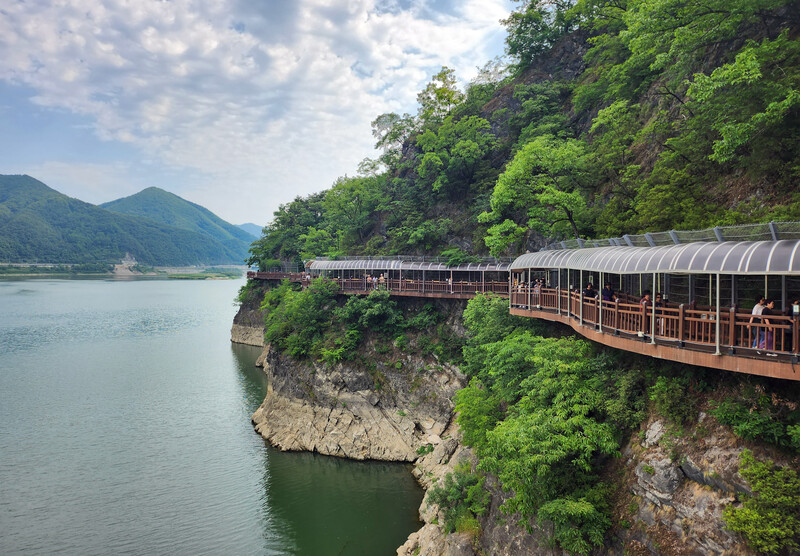 | ▲ 단양강 물줄기 절벽에 1.2Km에 설치한 '단양 잔도 길'. "Danyang Jando-gil," established along a 1.2km cliff above the Danyang River. |