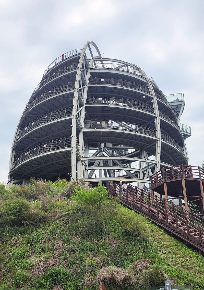 단양강 수면 위 90m 높이의 절벽에 '만천하 스카이워크'가 보였다. 목적지까지 셔틀버스로 이동했다. 구멍이 숭숭 뚫린 철제를 밟으며 시원한 바람 따라 둥글게 정상까지 밀리듯 올라갔다.
