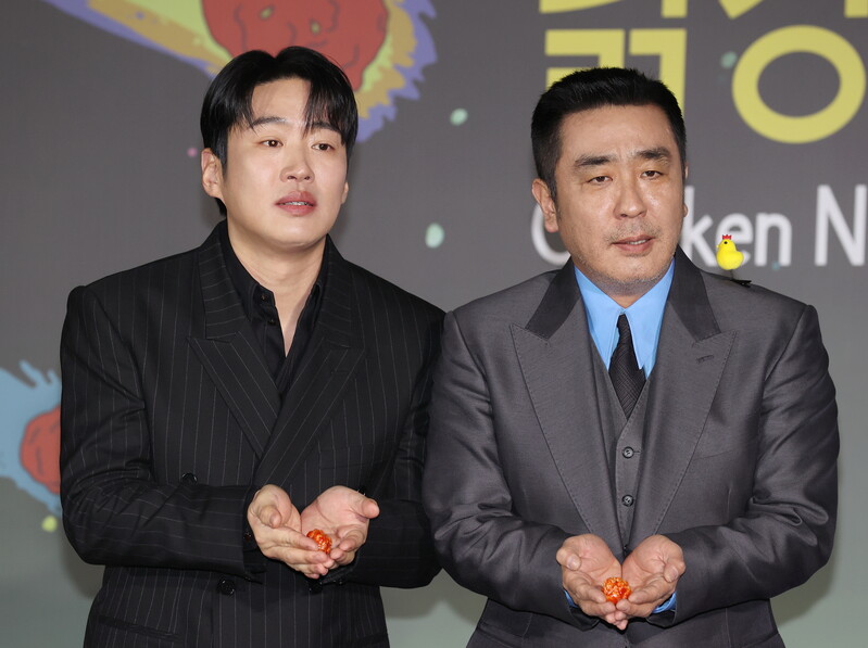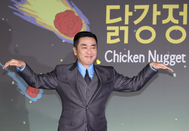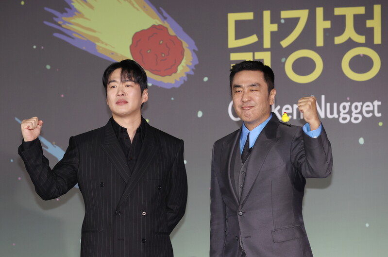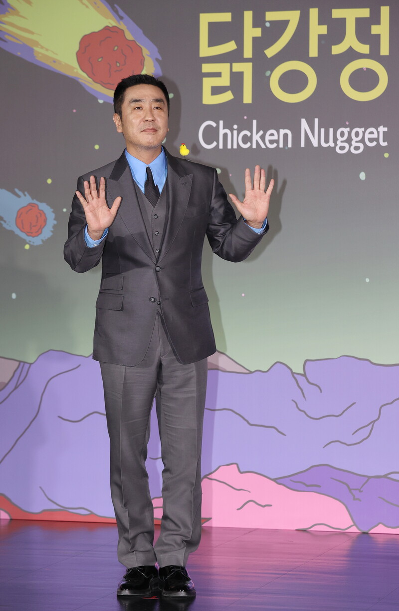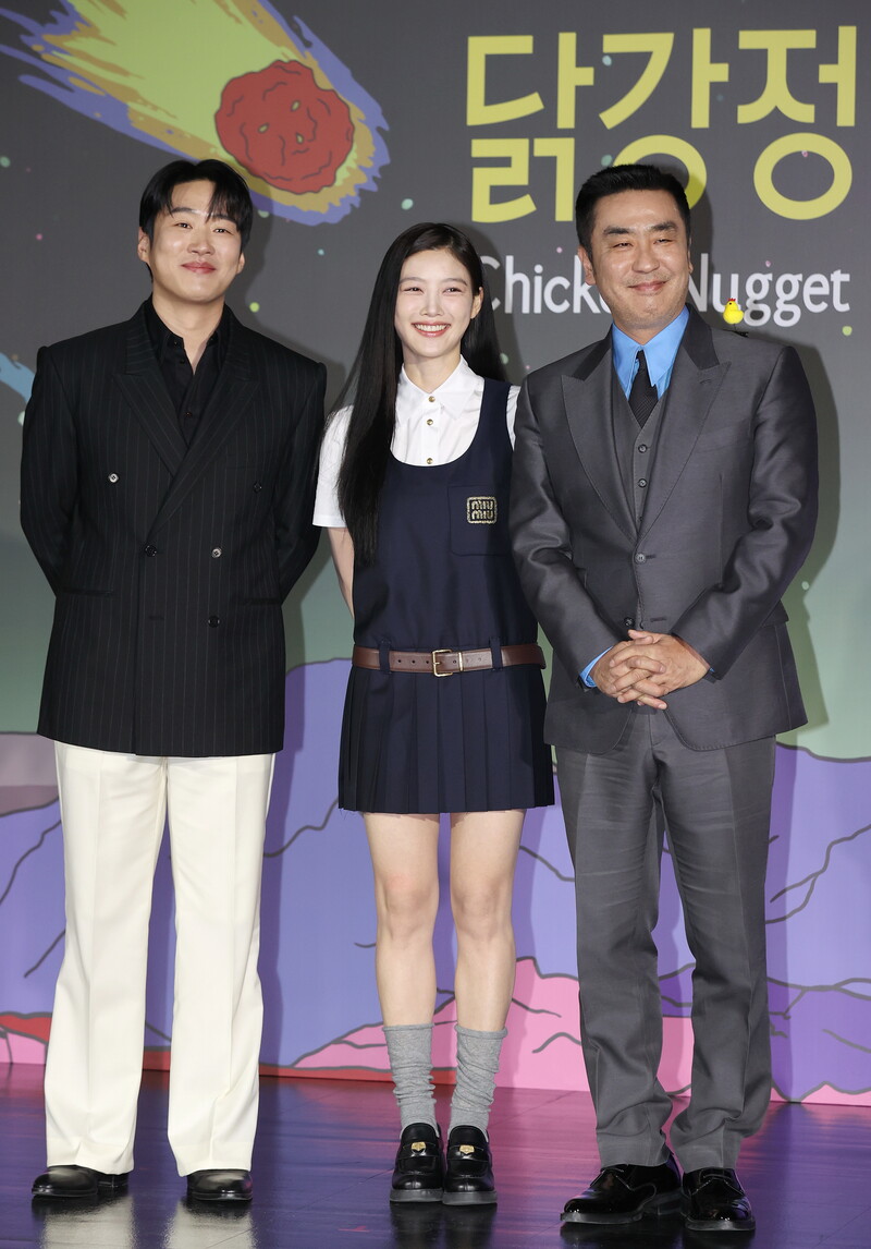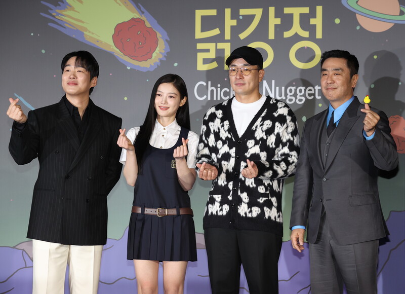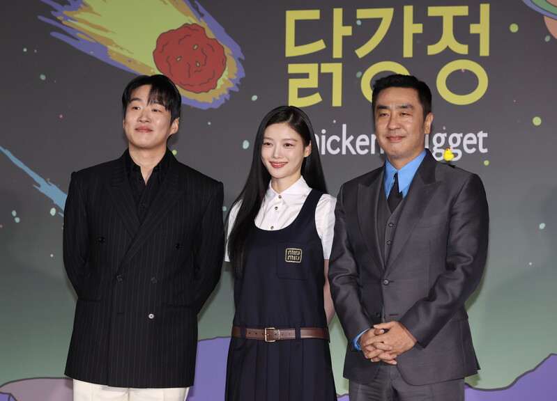The stars of the new movie "Chicken Nugget"  Ahn Jae-hong, Kim Yoo-jung and Ryu Seung-ryong along with director Lee Byung-hun are posing for various photos during a publicity event in Seoul on March 13, 2024. (Yonhap)