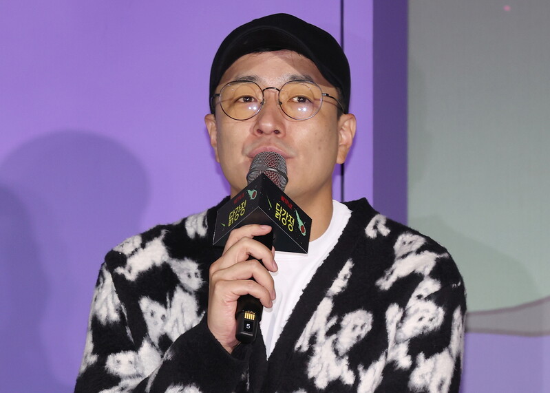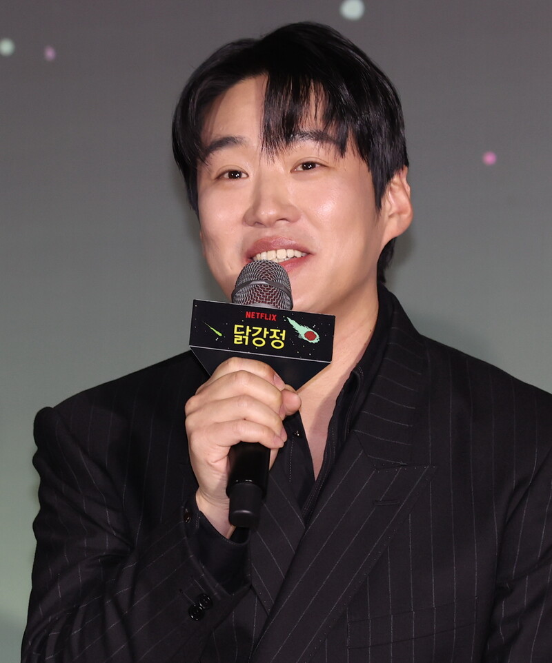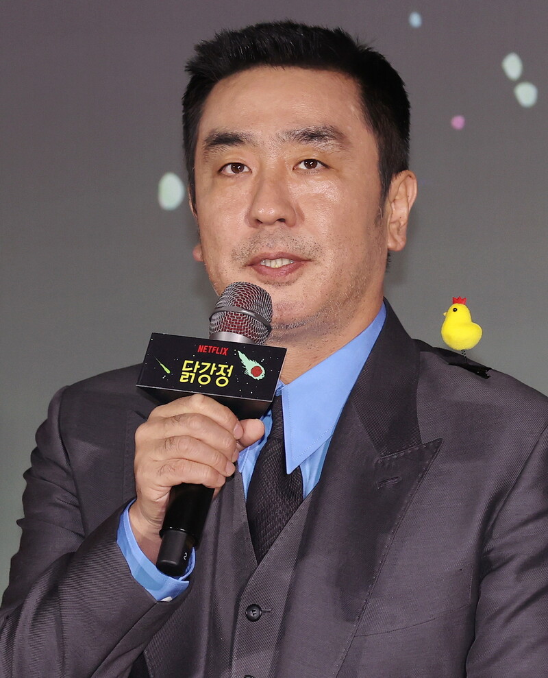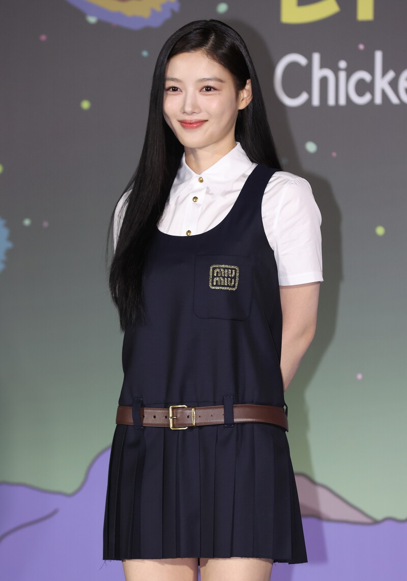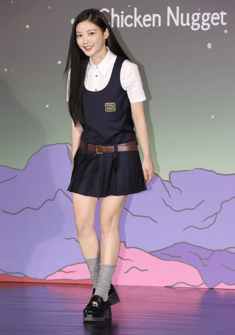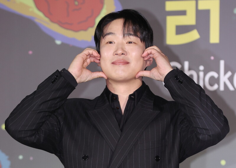 The stars of the new movie "Chicken Nugget"  Ahn Jae-hong, Kim Yoo-jung and Ryu Seung-ryong along with director Lee Byung-hun are posing for various photos during a publicity event in Seoul on March 13, 2024. (Yonhap)