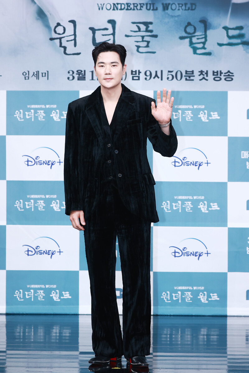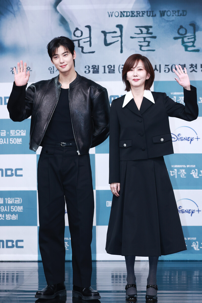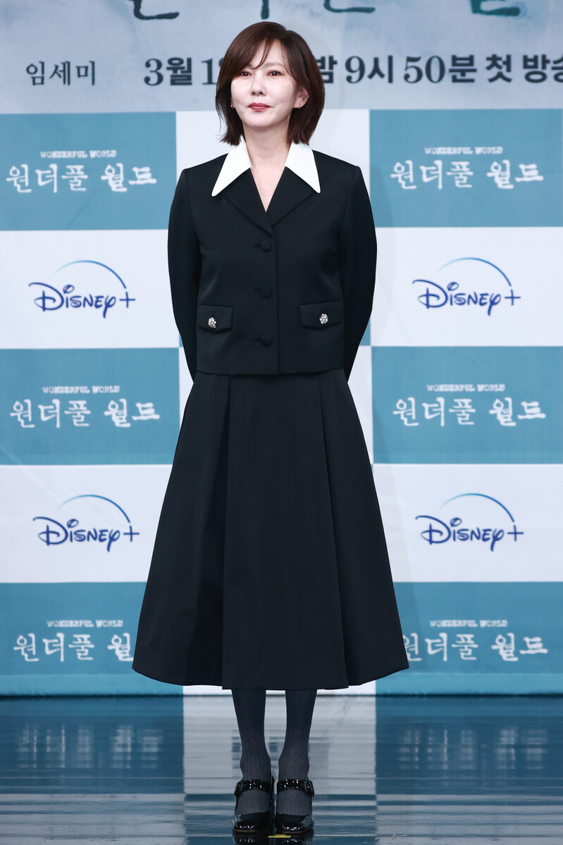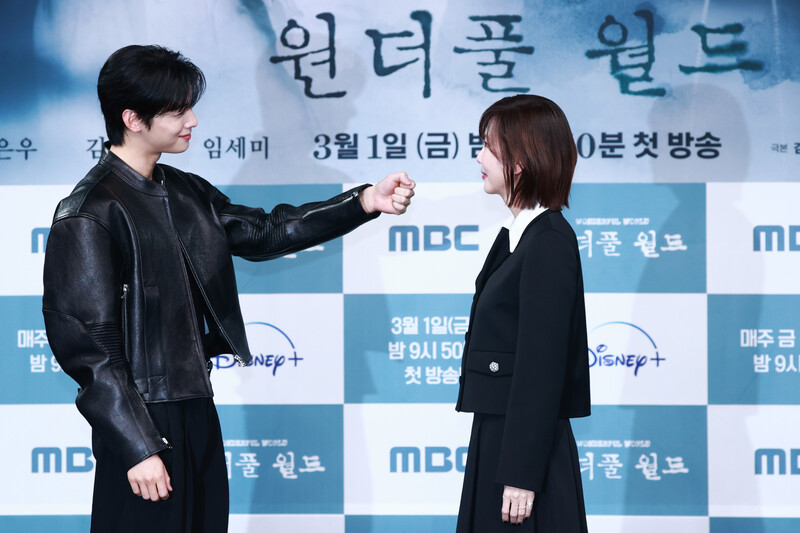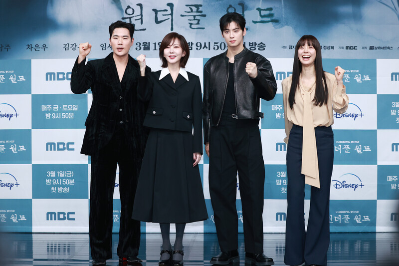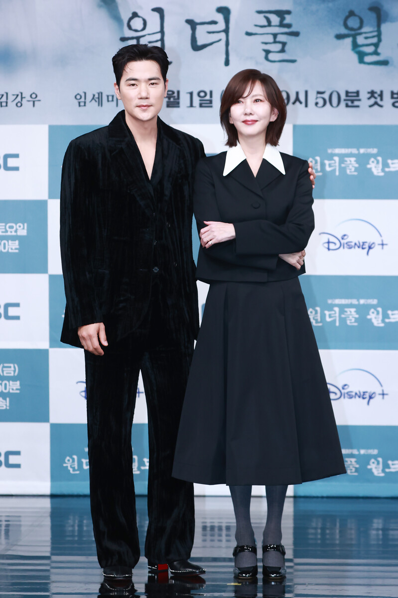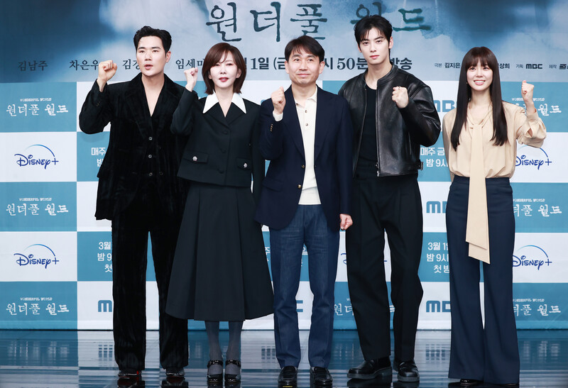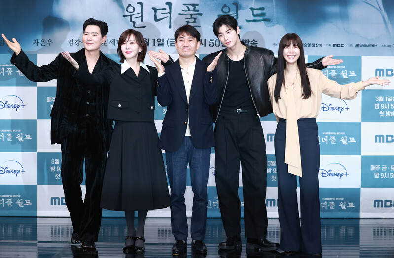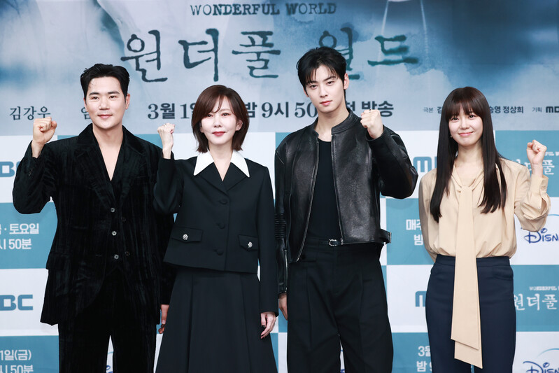Casts for the MBC-TV's new drama "Wonderful World," poses for a photos during a publicity event in Seoul on Feb. 29, 2024. The first episode of the drama was aired on March 1. (Yonhap)