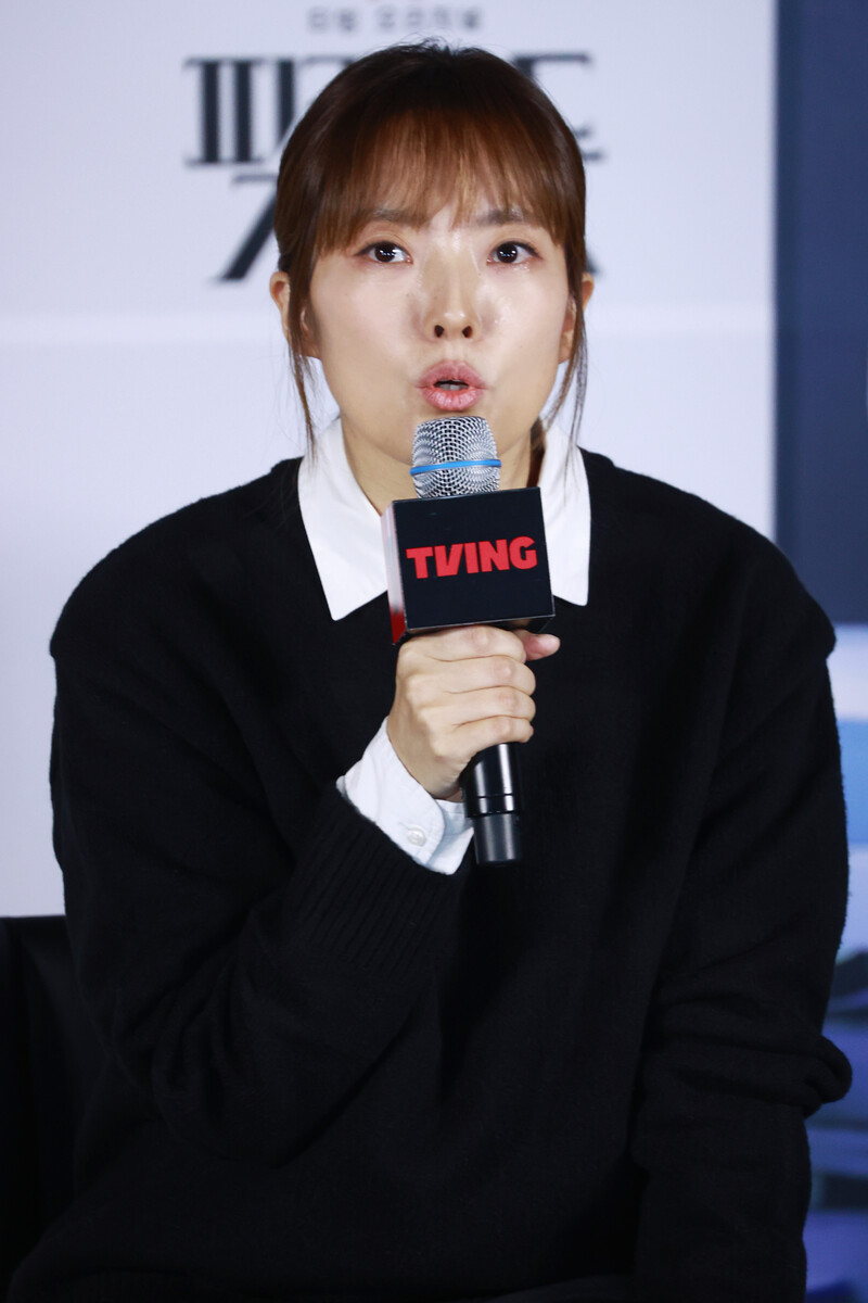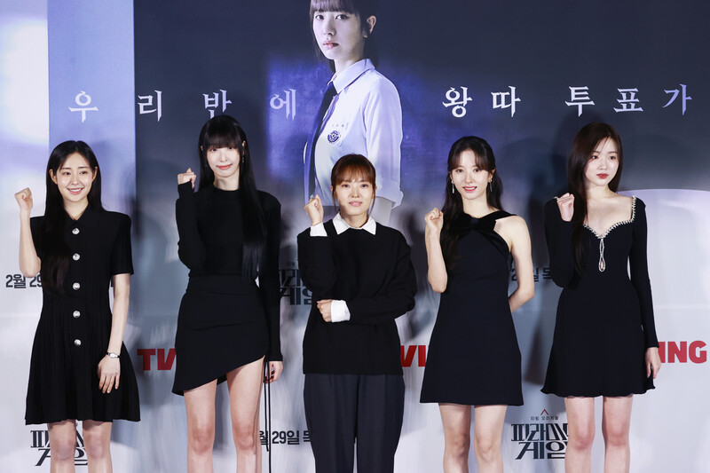 The stars of the new drama "Pyramid Game" an original series by TVing -- Shin Seul-ki, Ryu Da-in, Kim Ji-yeon and Kang Na-un are posing for a photo during a publicity event in Seoul on Feb. 26, 2024. The first episode of the series will be available on Feb. 29.