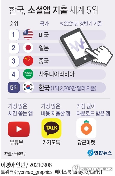 ▲ [그래픽] 한국, 소셜앱 지출 세계 5위 (서울=연합뉴스) 장예진 기자 = jin34@yna.co.kr |