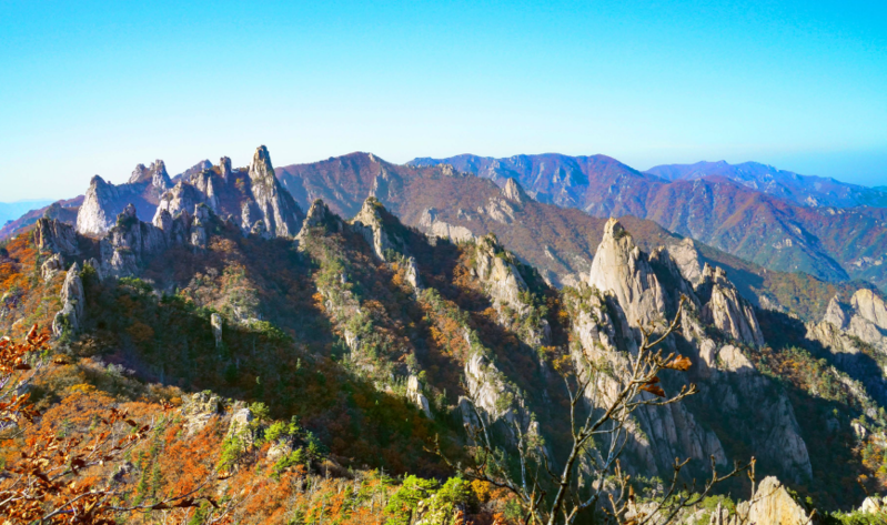 When autumn comes to Seoraksan, known for being one of the first places in the country where fall foliage arrives, it excites enthusiasts of the Dinosaur Ridge circuit. However, hiking the Dinosaur Ridge is not easy. The Dinosaur Ridge circuit is considered a very difficult hike, not only because of the rugged terrain but also because of the length of the course. On the trail, known as the "Dinosaur," hikers have to ascend and descend rocky ridges, rising 100 to 200 meters and then descending again, repeating this process 7 to 8 times. There are no escape routes to descend to the base of the mountain in case of fatigue or emergency situations. Once you start the circuit, there are only two options: to continue to the end or return to the starting point. Since there are no streams along the way, hikers must carry all the drinking water they need. It is recommended to carry more than 2 liters of water, and the weight of the gear, including food, clothing for cold weather and rain, hiking equipment, and emergency supplies, makes the ascent even more challenging.