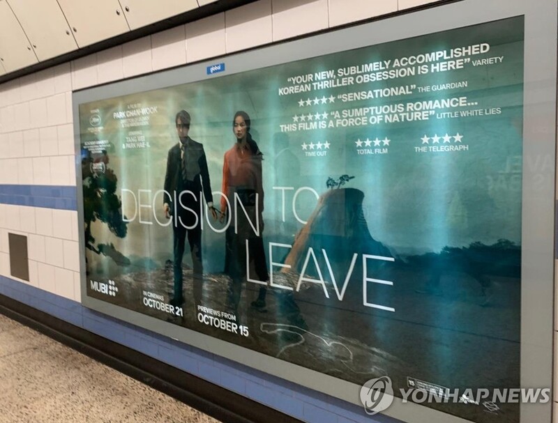 ▲ This photo, taken in London, shows the advertisement of 'Decision to Leave' displayed at one of the London railway stations. (PHOTO NOT FOR SALE) (Yonhap) |