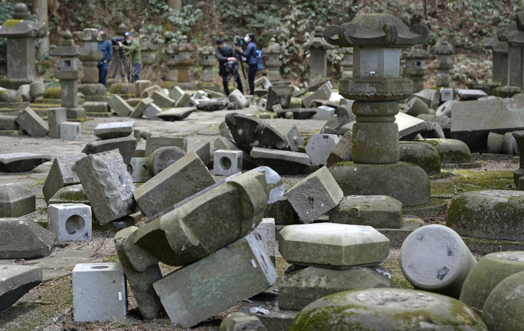 | ▲ 후쿠시마 앞바다 지진에 훼손된 묘지 시설 (후쿠시마 교도=연합뉴스) 일본 후쿠시마(福島)현 앞바다에 규모 7.3의 지진이 발생한 다음날인 14일 오전 후쿠시마현의 한 묘지에 석조 시설물이 훼손돼 있다. |