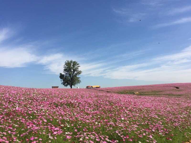 In the spring, rye and rapeseeds cover the pasture while sunflowers appear in the summer, cosmos and pink muhly grass in autumn create an atmosphere for visitors as if they're are abroad.