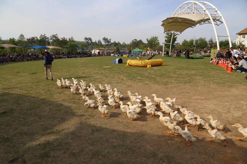 | ▲ This photo provided by Anseong Farmland shows one of the livestock performances where ducks are filed in one line and marching together. (PHOTO NOT FOR SALE) (Yonhap) |