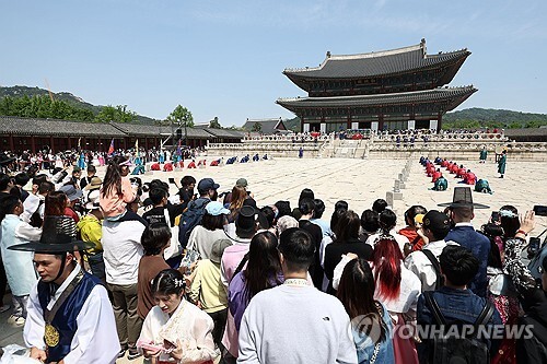 | ▲ Citizens and tourists visiting Gyeongbokgung Palace in Seoul watch the "A Day in the Life of King Sejong" performance in front of Geunjeongjeon on the Labor Day holiday on May 1, 2024. (Yonhap) |