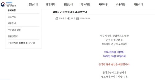 | ▲ This notice is captured from the homepage of the Royal Palaces and Tombs Center under the Cultural Heritage Administration. (PHOTO NOT FOR SALE) (Yonhap) |