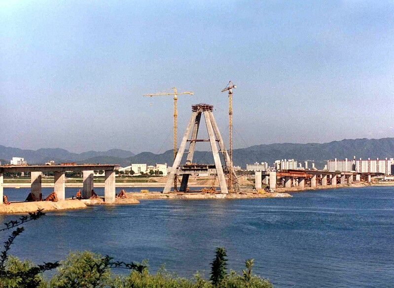 | ▲Olympic Bridge construction. Construction began in Nov.1985 and was completed in June 1990. In 2001, an army helicopter that was working to install a sculpture on the top of the main tower crashed, leaving three people dead. 1988. [Yonhap News] |