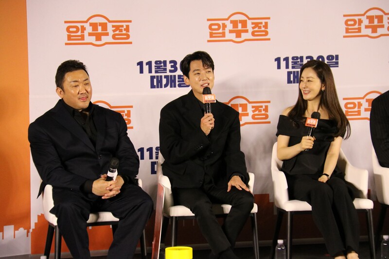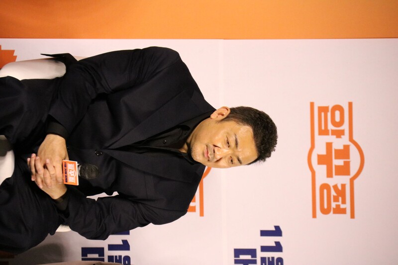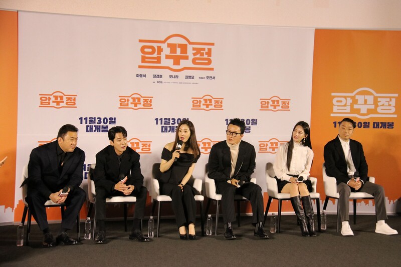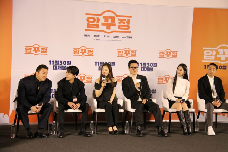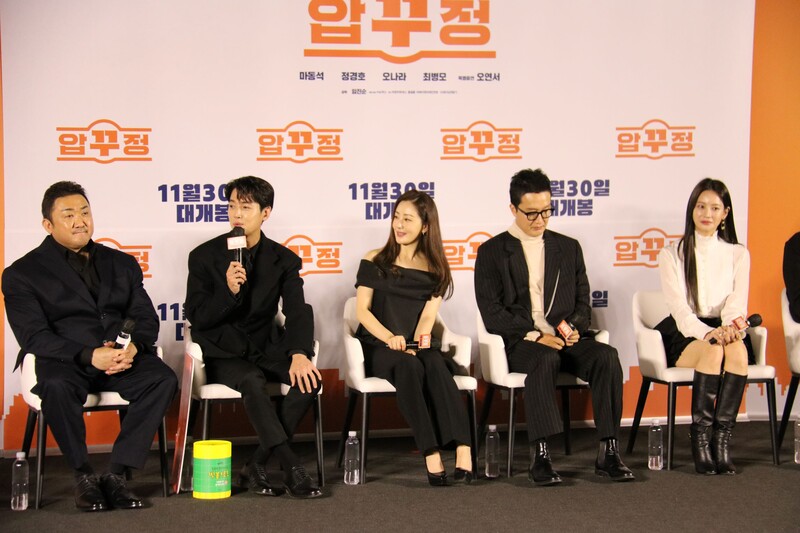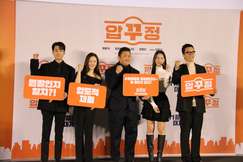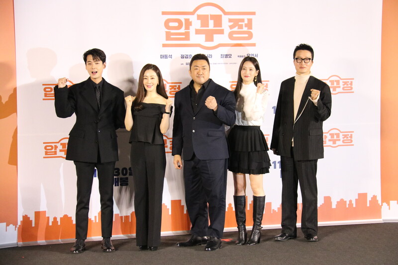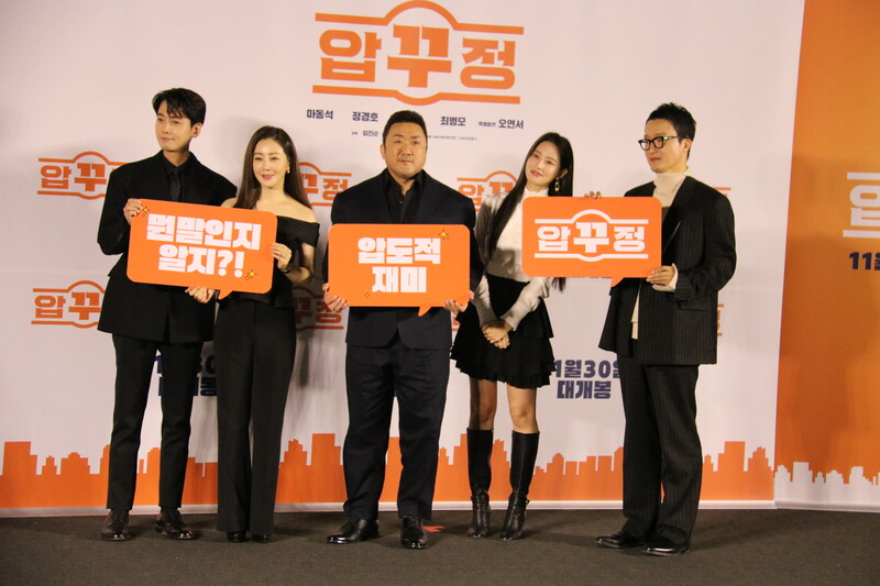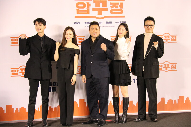 These photos, taken during the press conference of the upcoming South Korean movie "Men of Plastic" show cast members Ma Dong-seok, Jung kyung-ho, Choi byung-mo, actress Oh Na-ra and Oh Yeon-seo.
