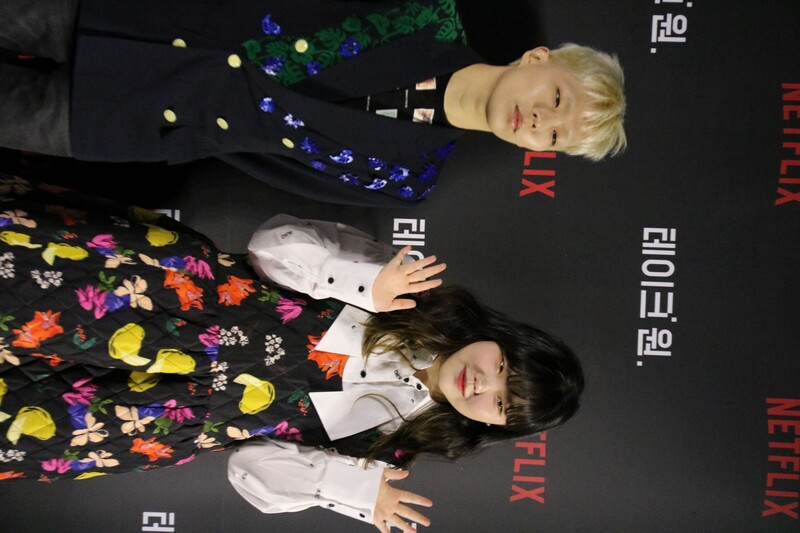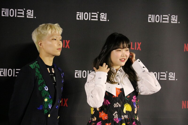 These photos show AKMU's Lee Chan-hyuk and Lee Su-hyun, and the producer of the show during the press conference for the new Netflix first Korean-language music variety show "Take 1."