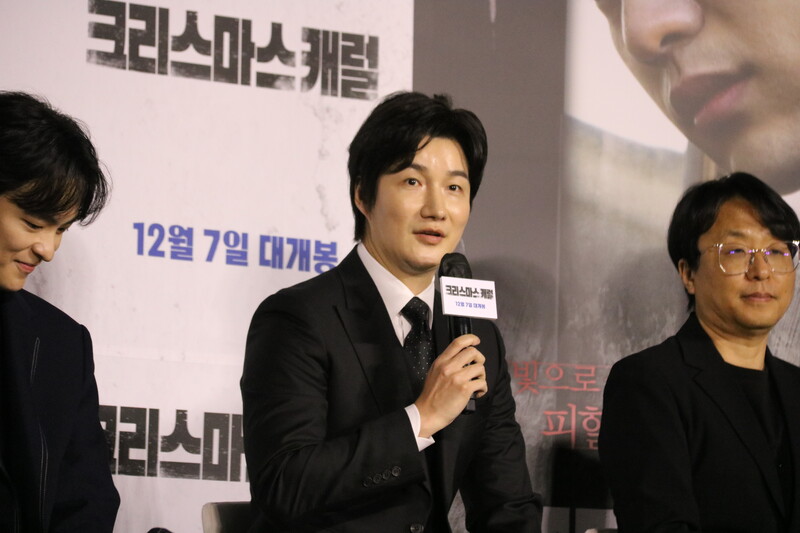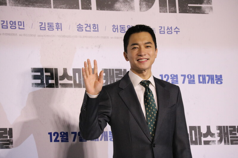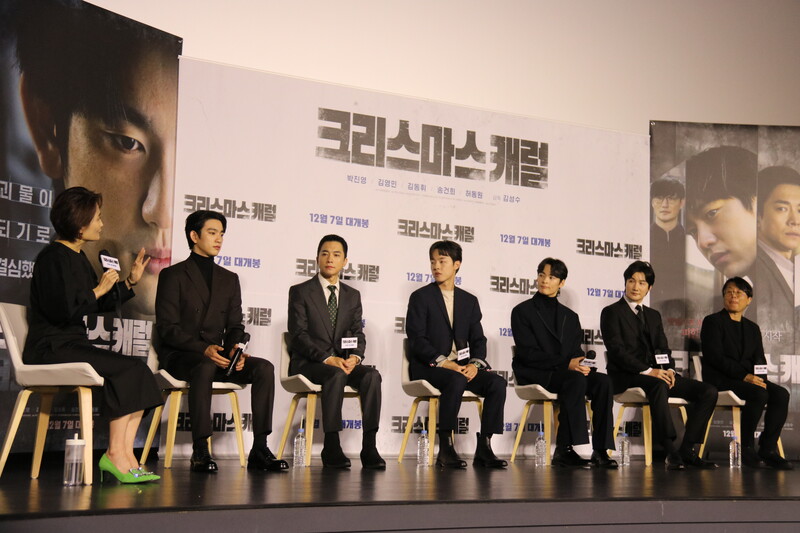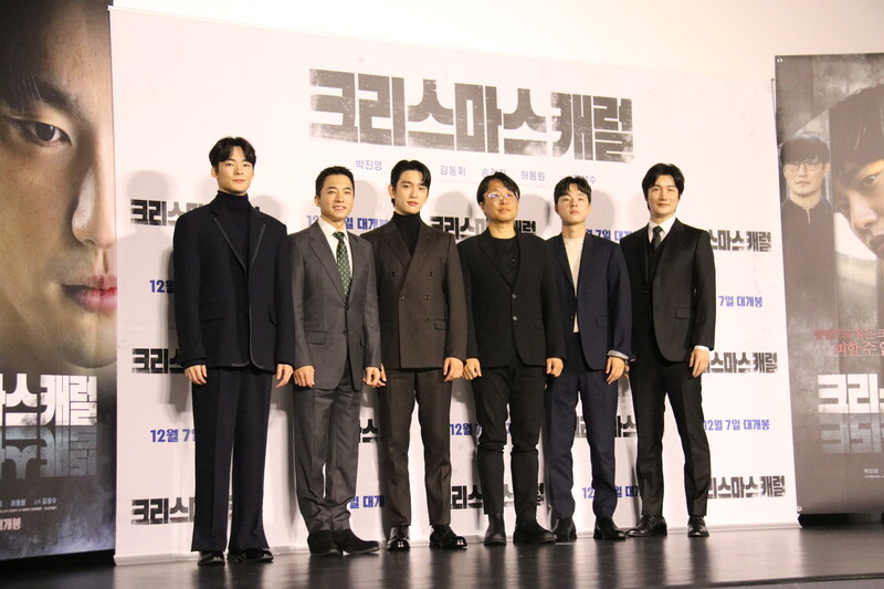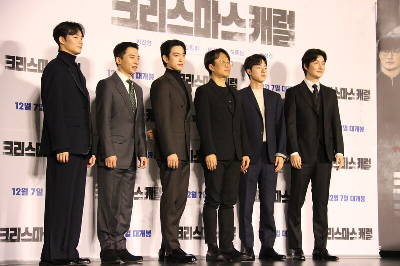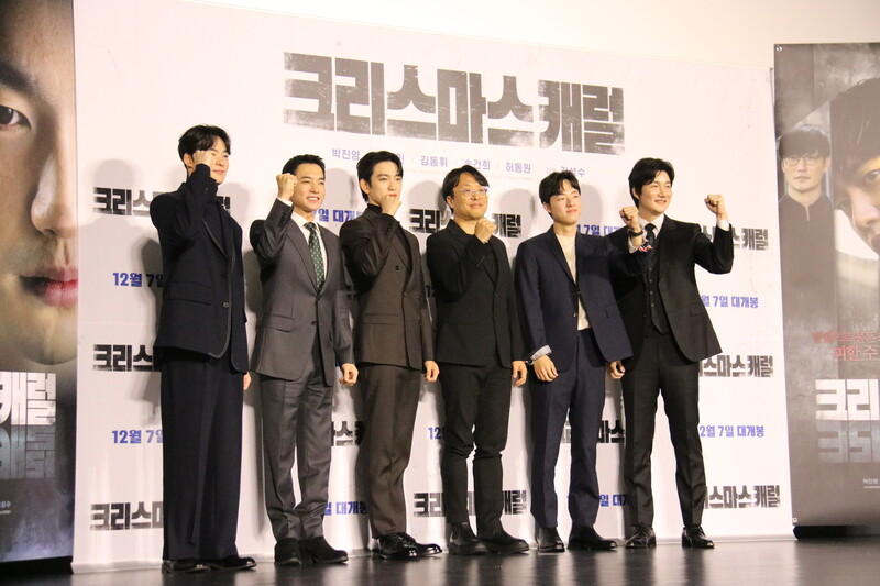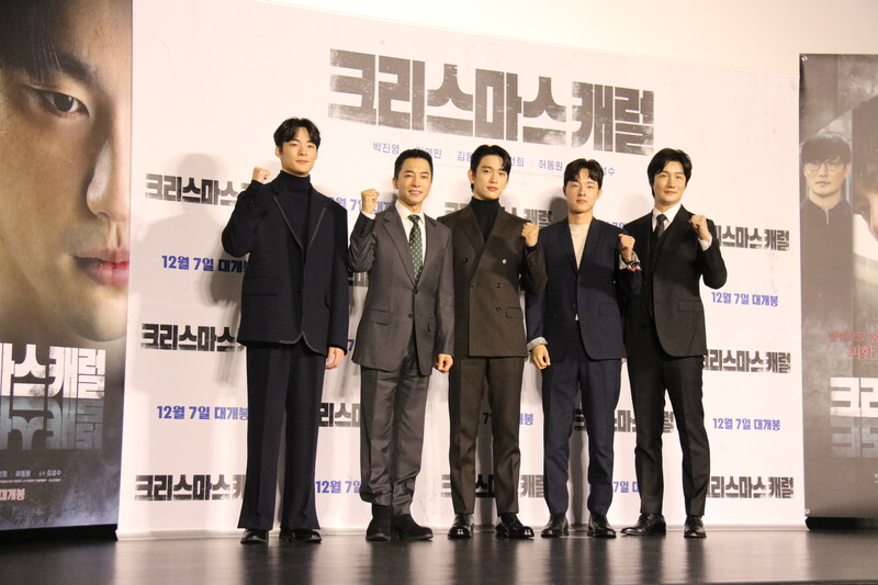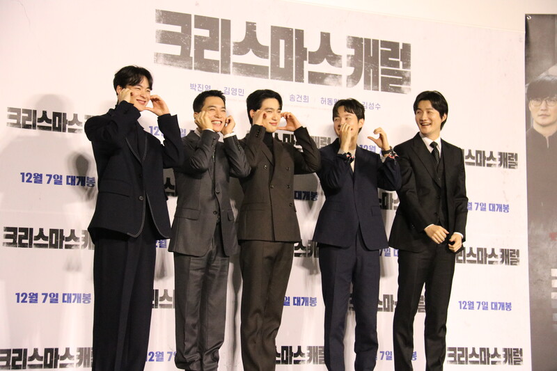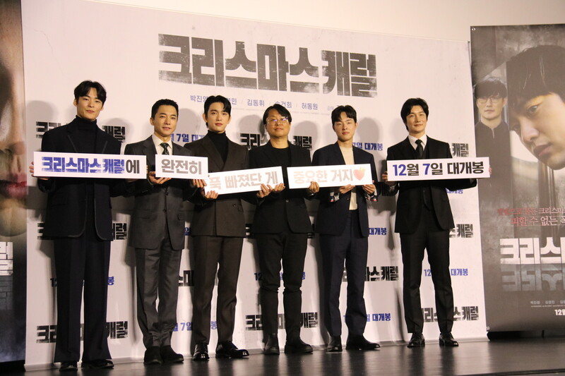 These photos show the cast of the movie "Christmas Carol" which will be released in December. Actors Park Jin-young, Kim Young-min, Kim Dong-hwi, Heo Dong-won, and Song Geon-hee participated the press conference.