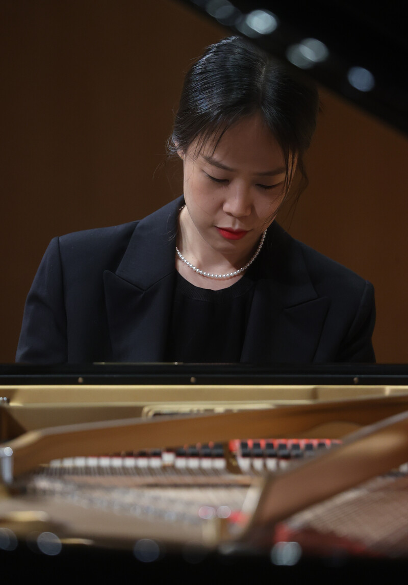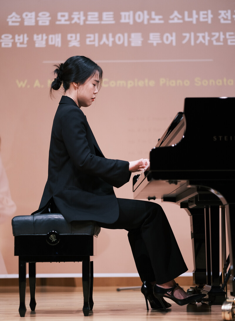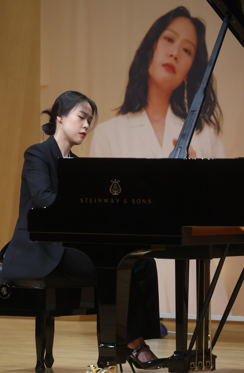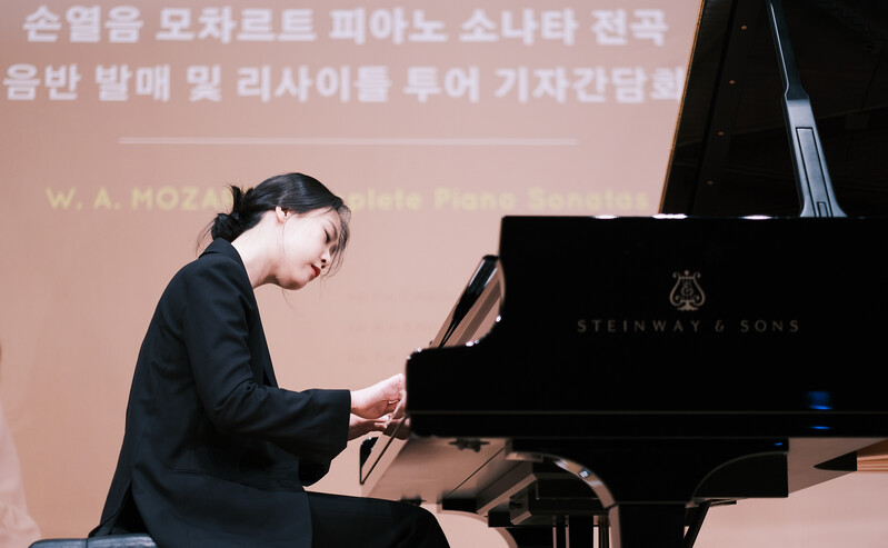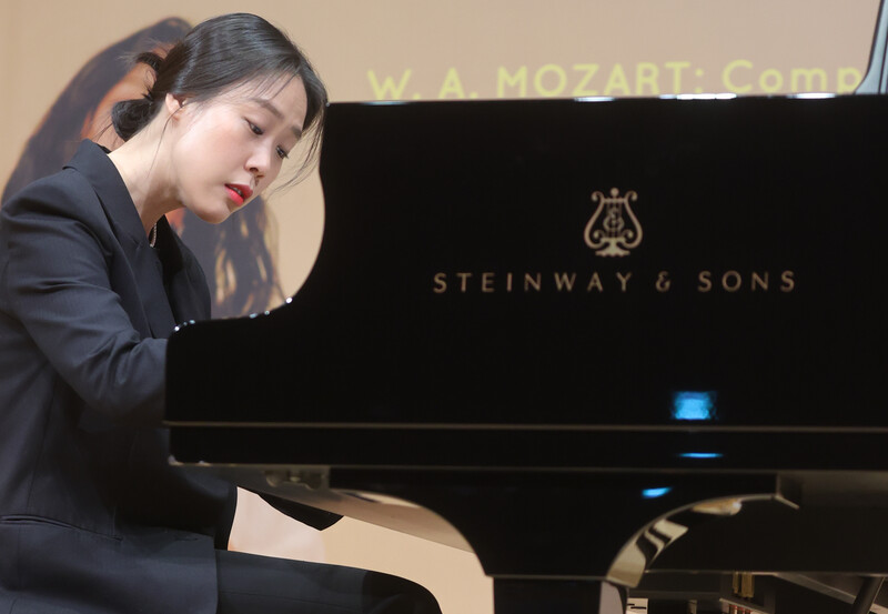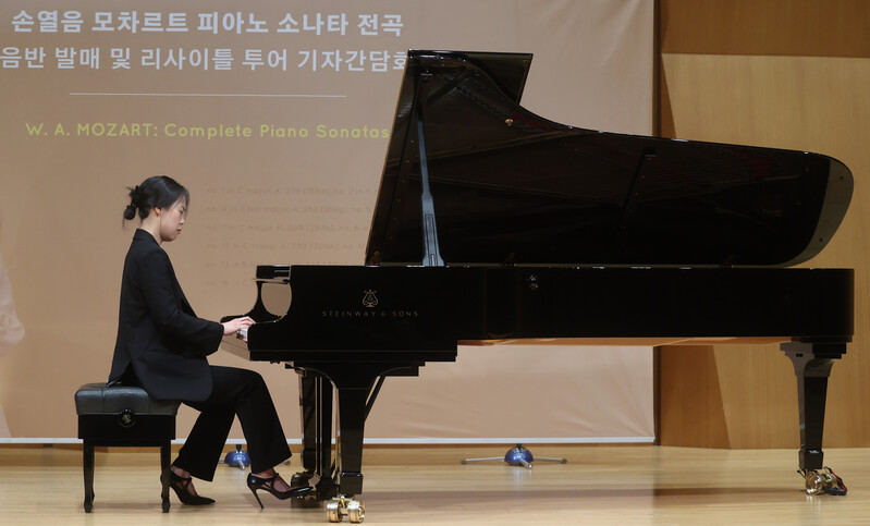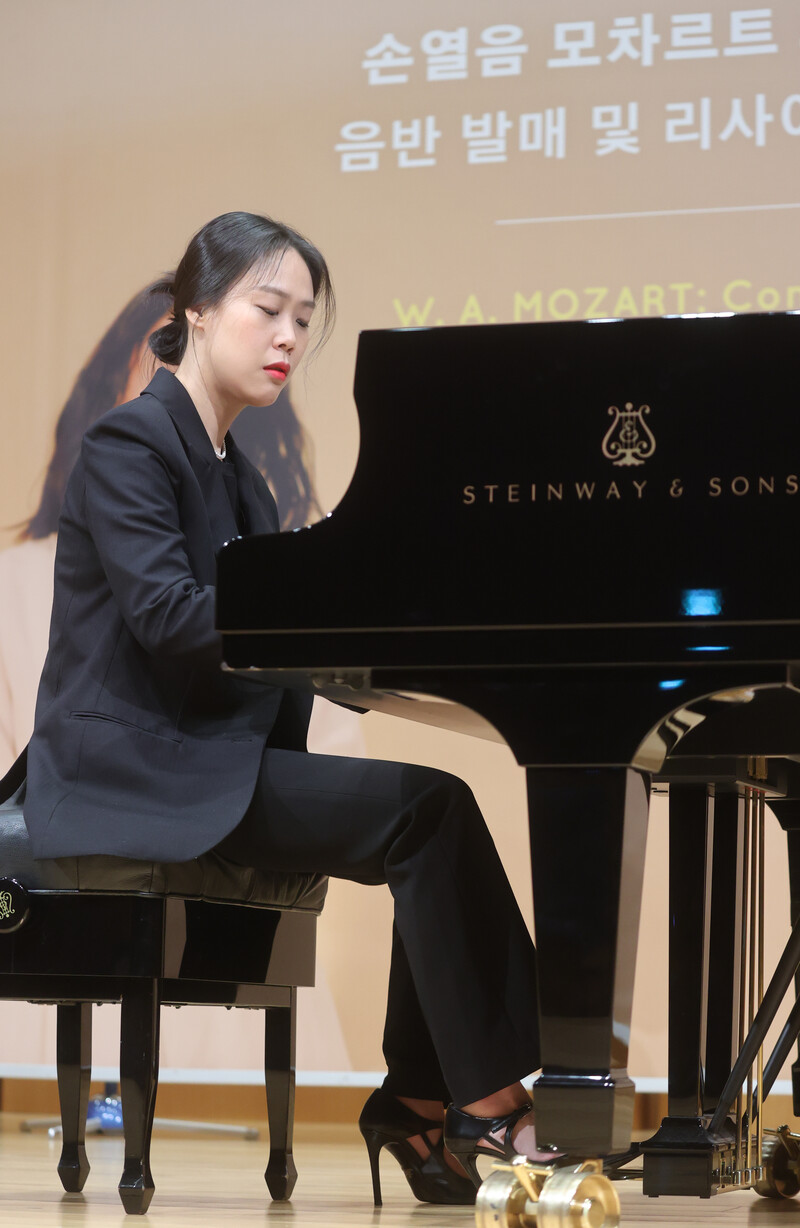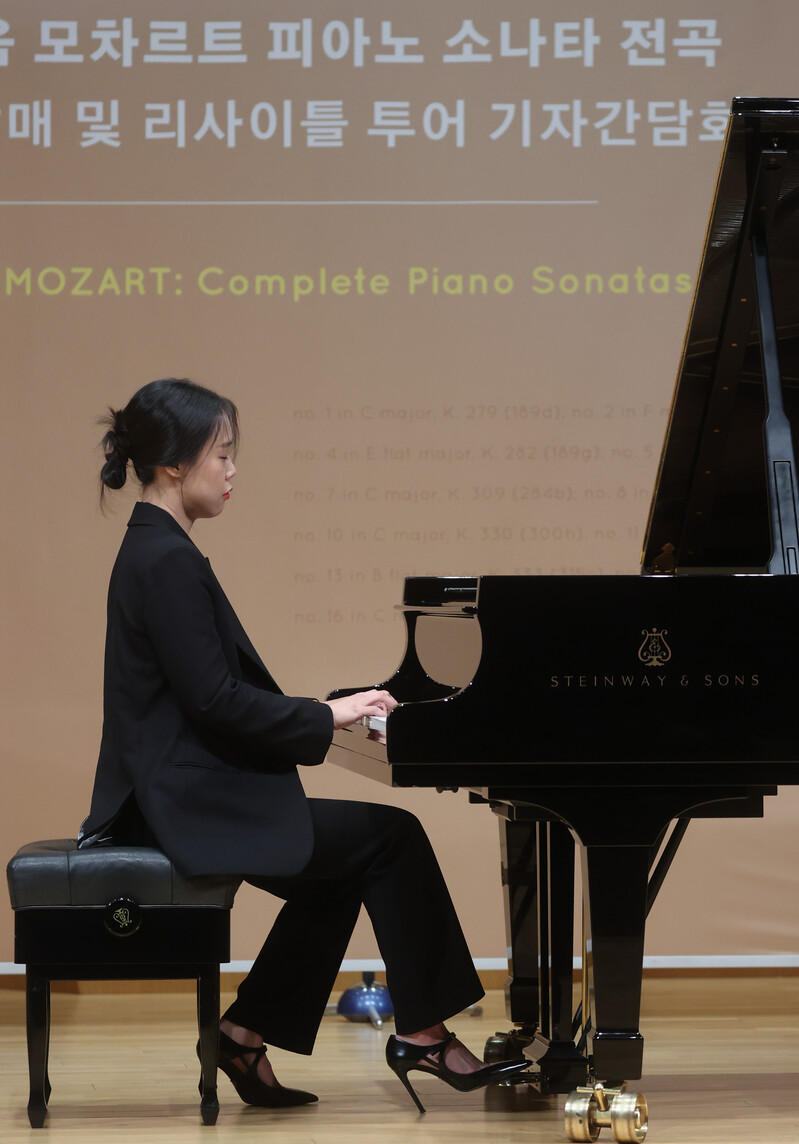 South Korean pianist Son Yeol-eum, the winner of the Silver Medal at the International Tchaikovsky Competition in 2011, performs during a press conference in Seoul on March 14, 2023, to mark the release of her album on Mozart's complete piano sonatas and upcoming nationwide concert tour. (Yonhap)