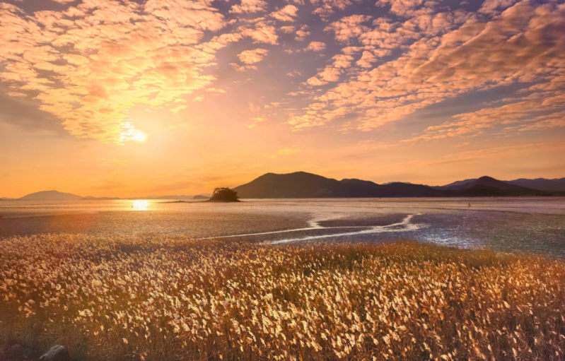In poet Shin Kyung-rim's poem "Reeds," there's a line, "Living is quietly weeping inside." With the ongoing economic downturn due to the pandemic, life remains challenging for many working-class people. Perhaps everyone is pretending to live joyful and happy lives. Suncheon, where reeds abound, is not only a quiet place to reflect on the past year but also an ideal destination for solo travel. Suncheon Bay, a paradise of golden reeds, boasts two notable attractions. The most famous spot is near the Yeosan Observation Deck in Suncheon Bay Wetland, while the other is the relatively less known Waon Beach. Waon Beach features an exquisite blend of vast mudflats and golden reeds, connected to the Yeosan Observation Deck by a long walking path.
