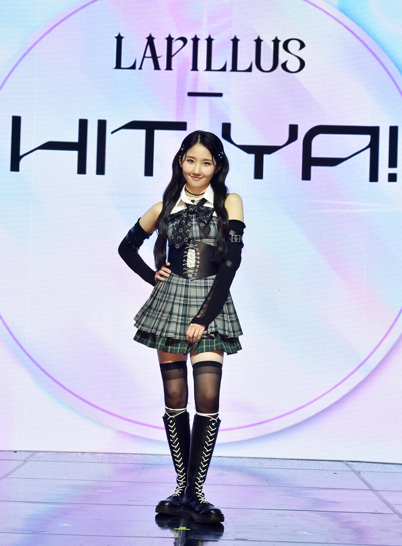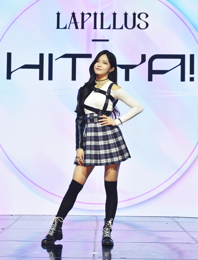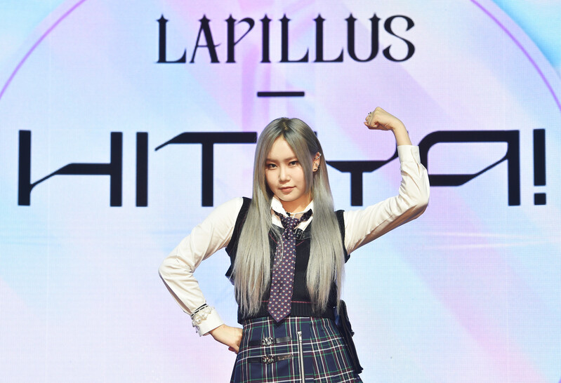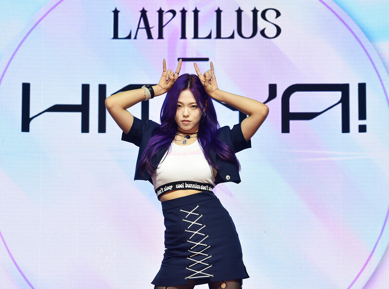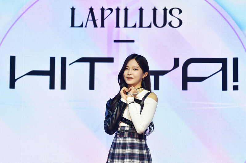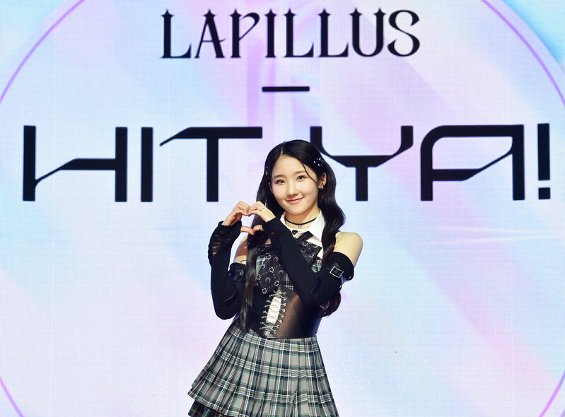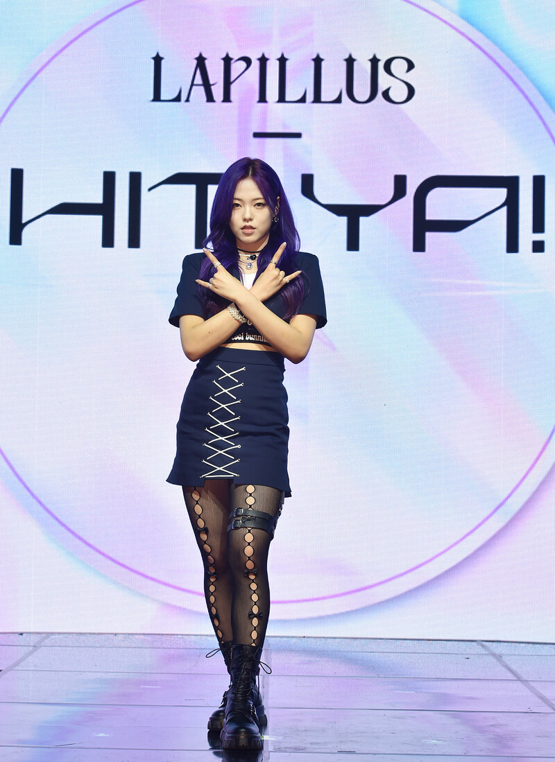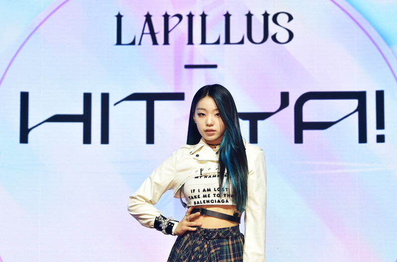 These photos, provided by MLD Entertainment, show girl group Lapillus at the media showcase of debut album "HIT YA!," which was held on June 20th, 2022.
