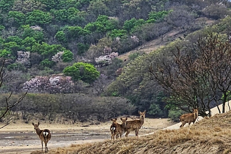 억새가 이어지는 능선길이 오름 같은 느낌이었다. 감탄을 멈추기 어려운 바다 전망은 물론 간간히 뛰어 노는 사슴들의 모습들, 해풍을 맞고 자라는 소사나무 등은 ‘이색적’임을 넘어 ‘사색적’이기도 했다.