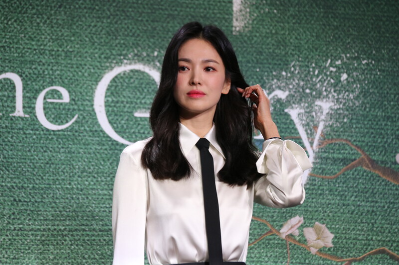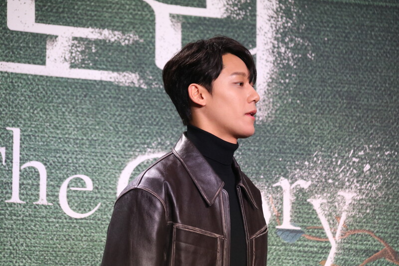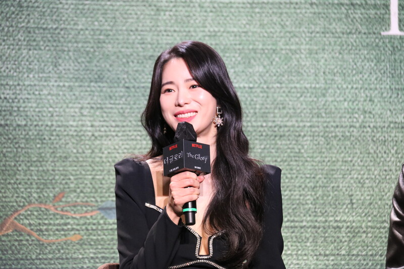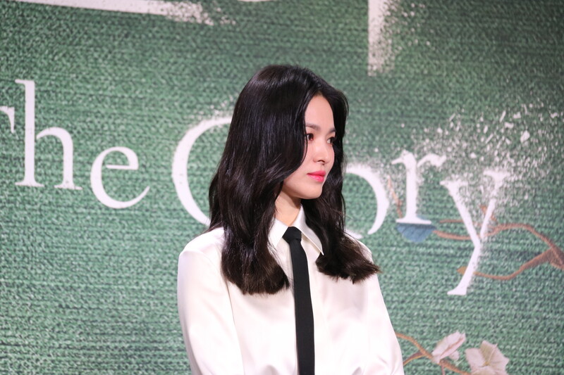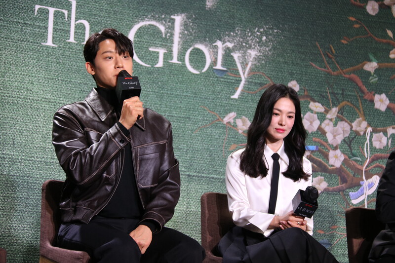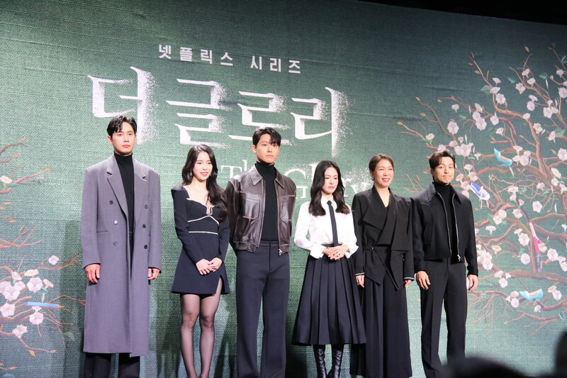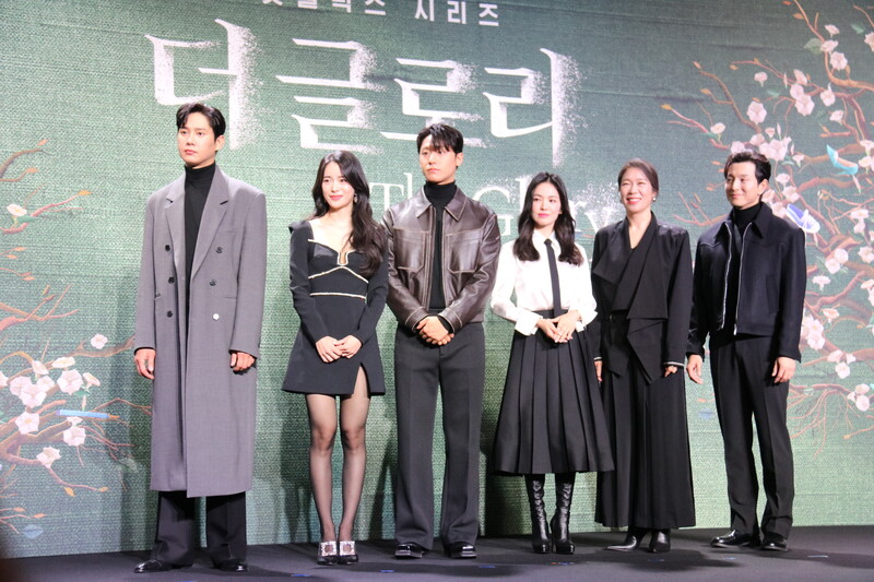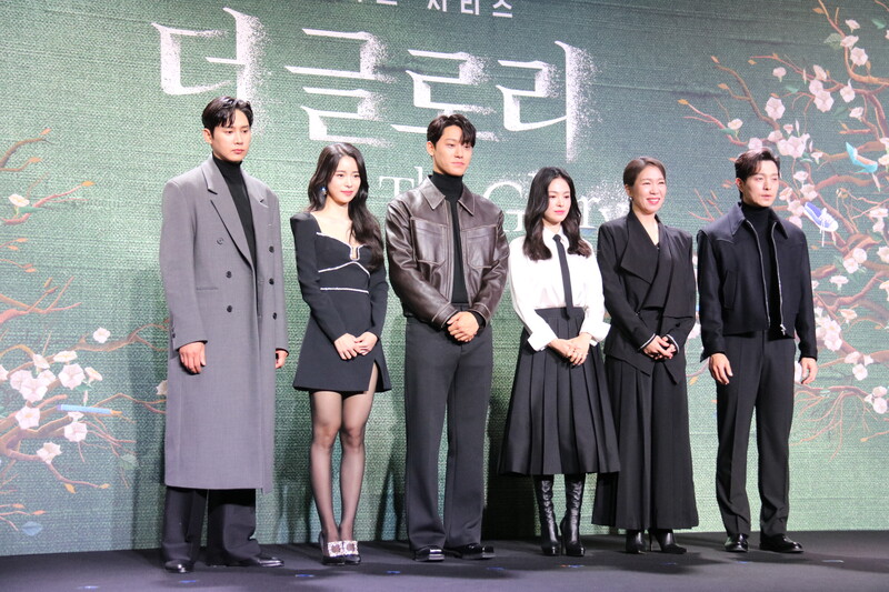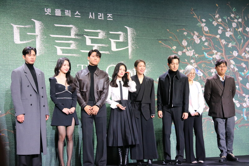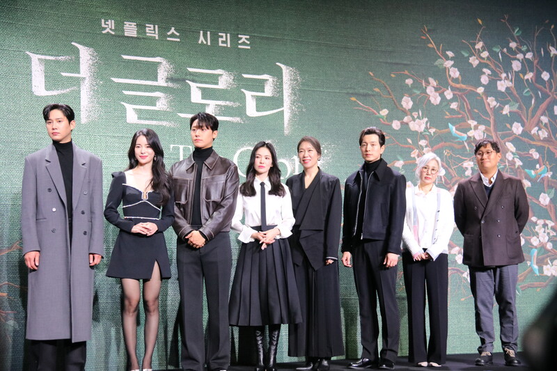 These photos show actors Song Hyekyo, Lee Dohyun, Im Jiyeon, Yun Hyeran, Park Sunghoon, Jung Sungil, screen writer Kim Eun-sook. and director Ahn Gil-ho during press conference of Netflix series "The Glory" which will be released on December 30.