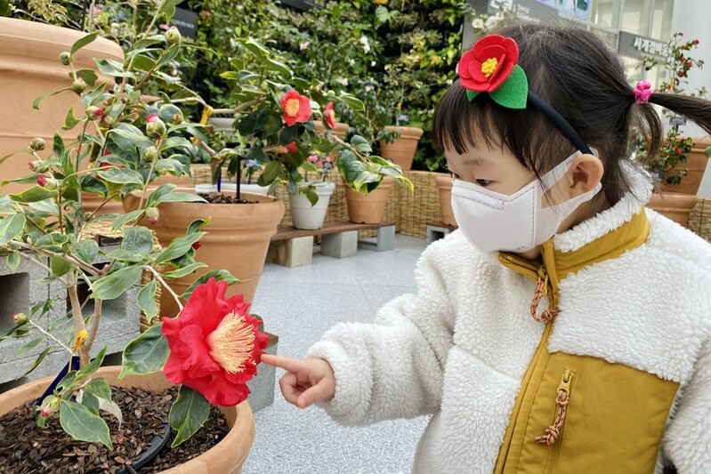 ▲ This photo, provided by Sejong National Arboretum, shows a child looking at a camellia flower in full bloom. (PHOTO NOT FOR SALE) (Yonhap) |