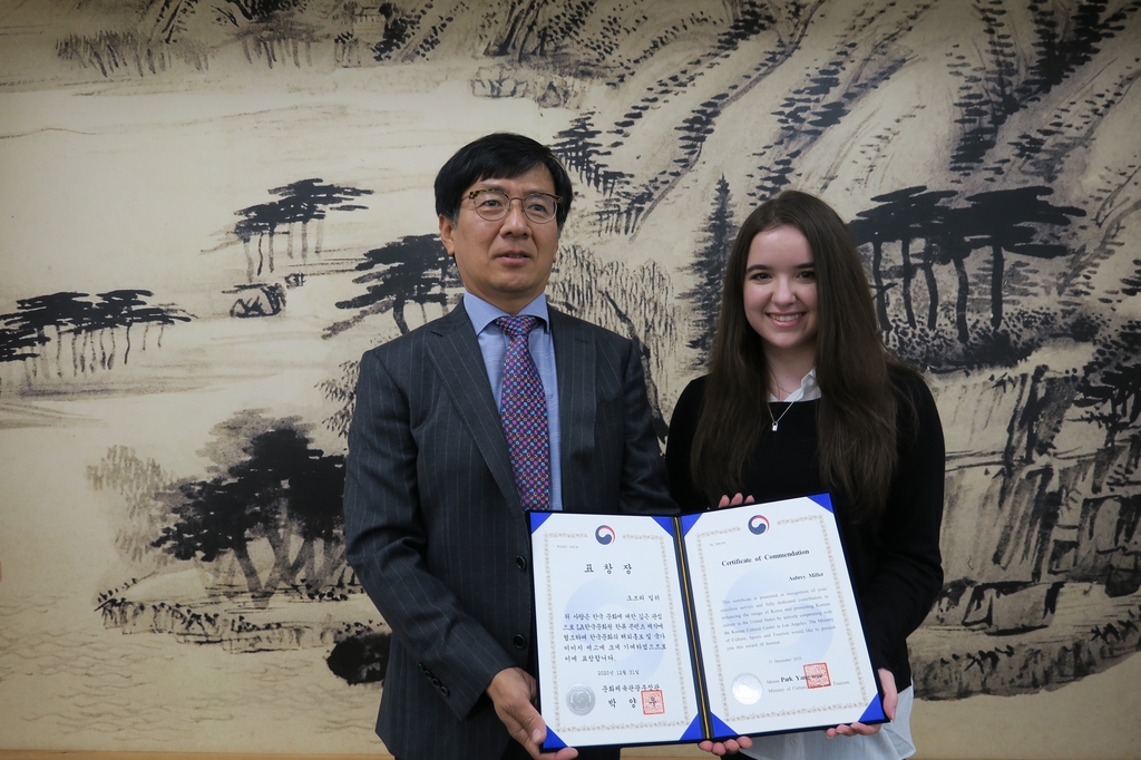 주 로스앤젤레스(LA) 한국문화원(원장 박위진)은 5일(현지시간) 미국 배우 겸 가수인 오브리 밀러에게 문화체육관광부 장관 명의의 '해외문화홍보 발전 유공자' 표창장을 전달했다고 밝혔다.