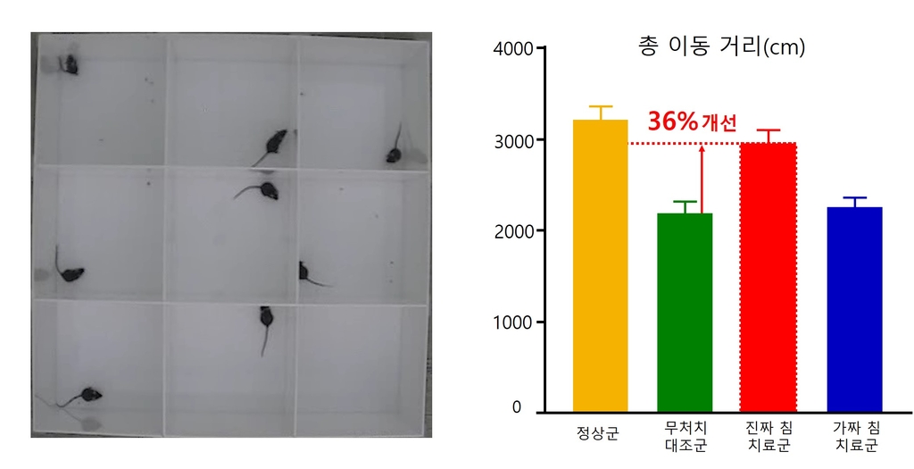 침 치료 실험군의 경우 개방된 공간에서의 총 이동 거리가 36% 증가하고, 구슬을 땅에 파묻는 행동 습성 반응도 76% 느는 등 우울증이 개선된 모습을 보였다.