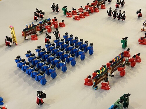 ▲ This photo, taken on May 16, 2024, shows 'LEGO Ohyang Ancestral Rites Banquet Arrangement Diagram' that artist Colin Jin personally created at the Seoul Jongmyo Hyangdaecheong, which reopened after a renovation. (Yonhap)