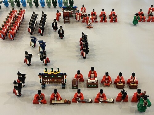 Percussion instruments played by the orchestra are represented by model logs of pirate ships, and janggu sticks are modeled after wands from the "Harry Potter" series. The strings tied to the gayageum are made of croissant-shaped LEGO block pieces.