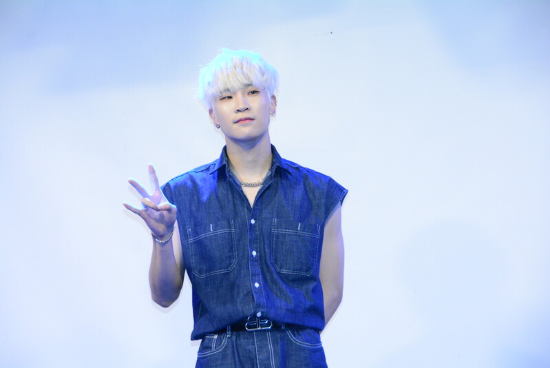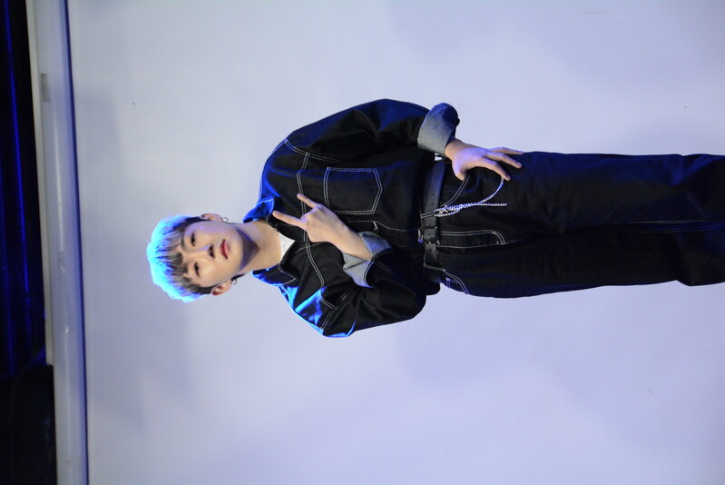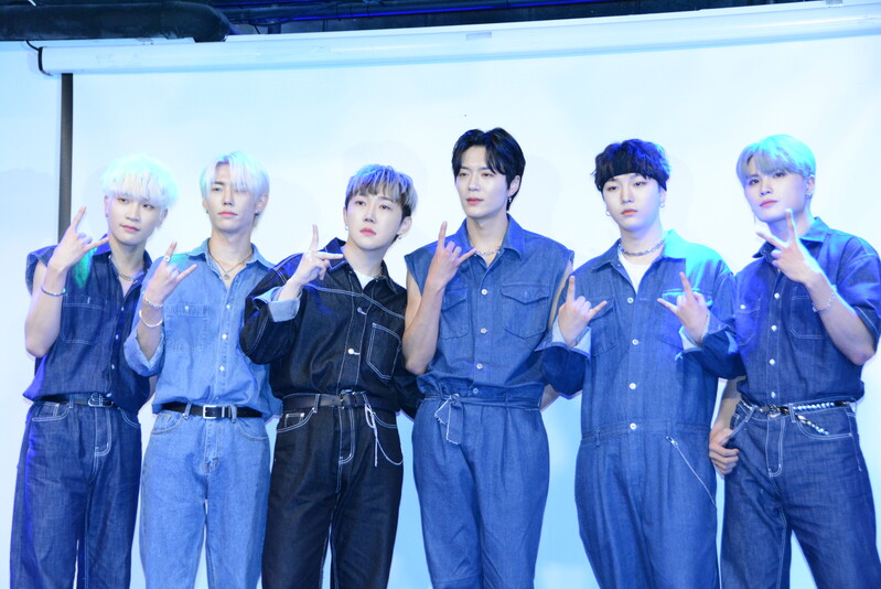 These photos, taken during the debut media showcase of K-pop boy group "ABLUE" and their debut album "Color The Start" show members pose for individual and group photos.