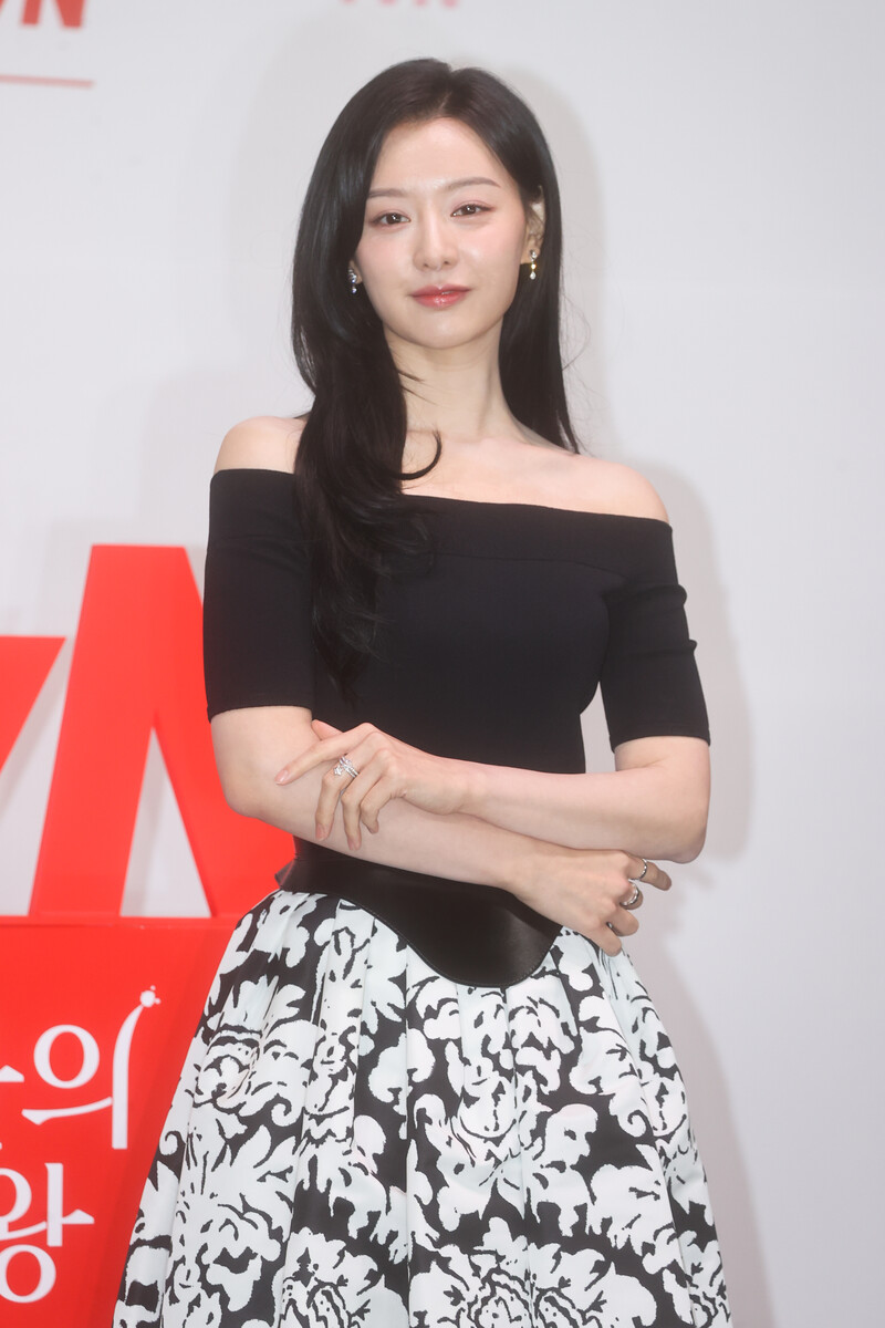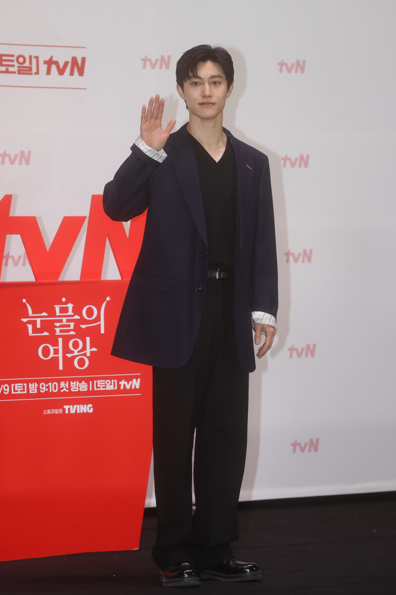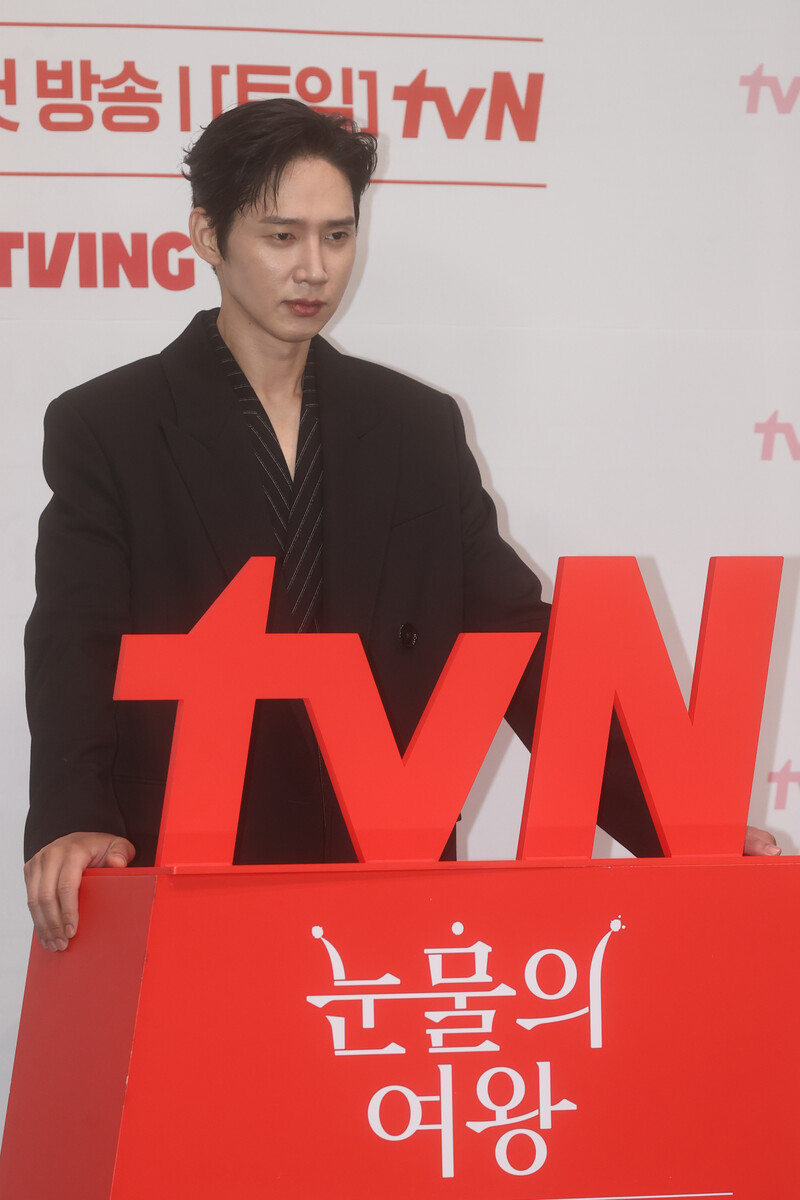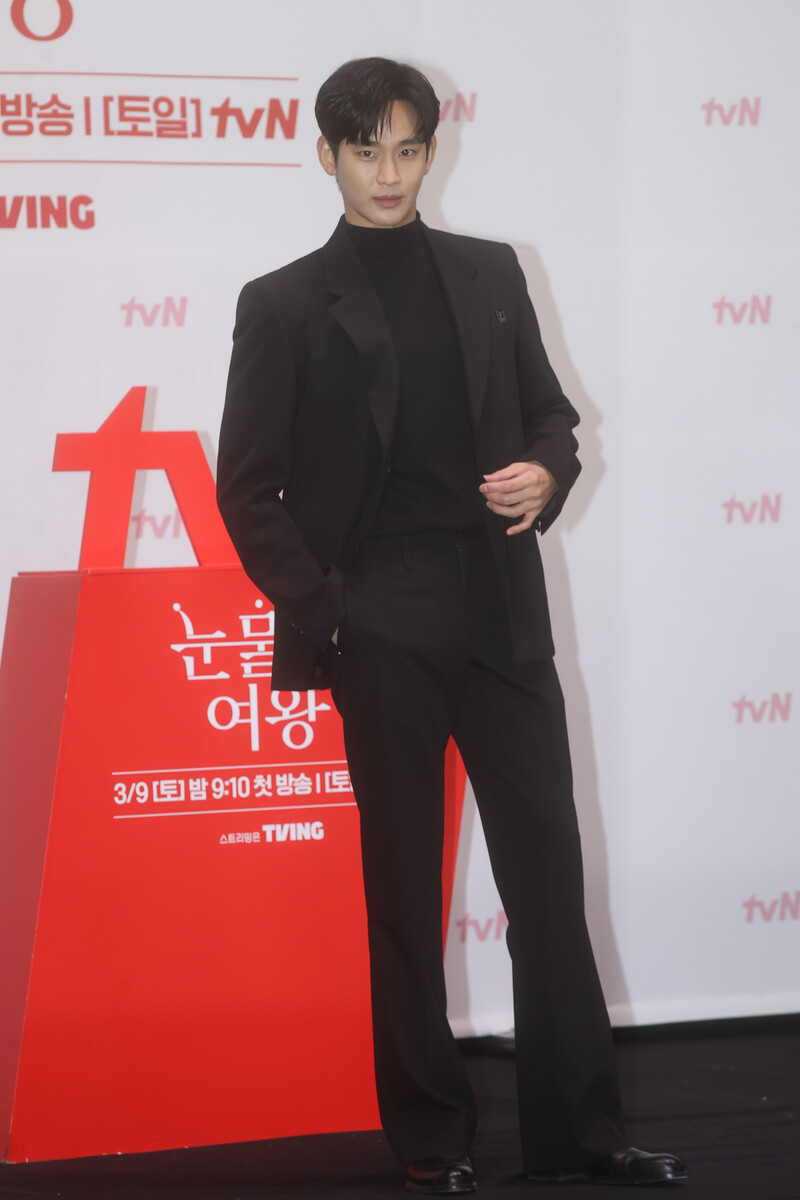 The stars of the new drama "Queen of Tears" -- Lee Joo-bin, Kwak Dong-yeon, Kim Ji-won, Kim Soo-hyun and Park Sung-hoon are posing for photos during a publicity event in Seoul on March 7, 2024. The first episode of the drama will be aired by the local cable TV network tvN on March 9. (Yonhap)