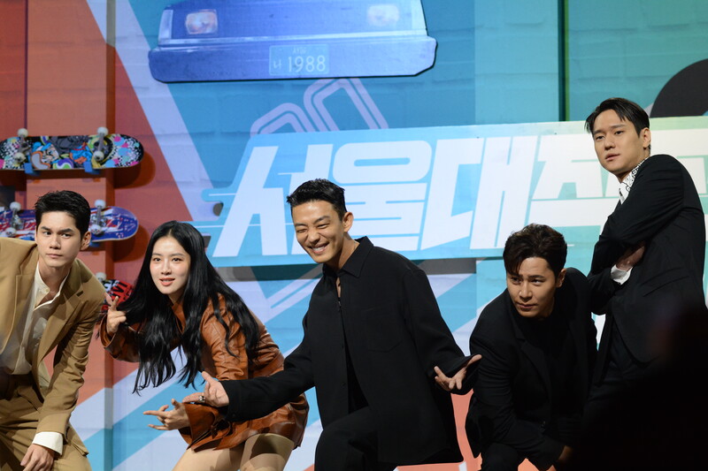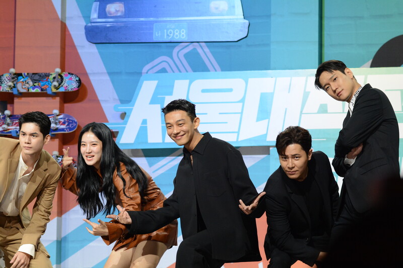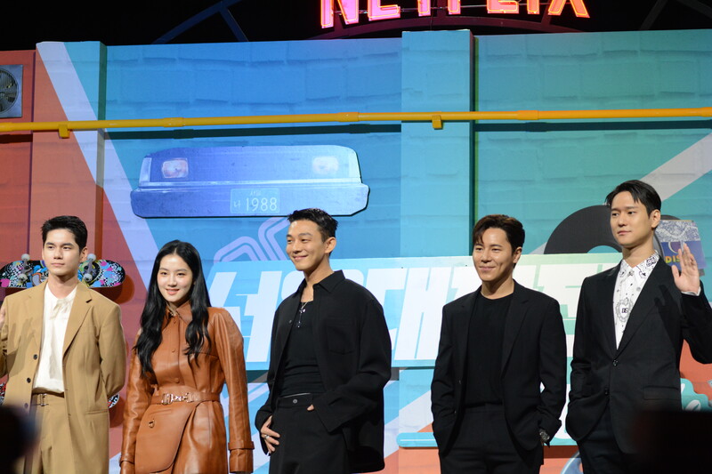 These individual and group photos taken during the press conference of upcoming South Korean Netflix movie "Seoul Vibe" show, actors Yoo Ah-in, Ko Kyung-pyo, Ong Seong-wu, Lee Kyoo-hyung, actress Park Ju-hyun and Moon So-ri posing for individual and group photots.