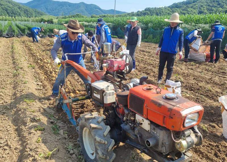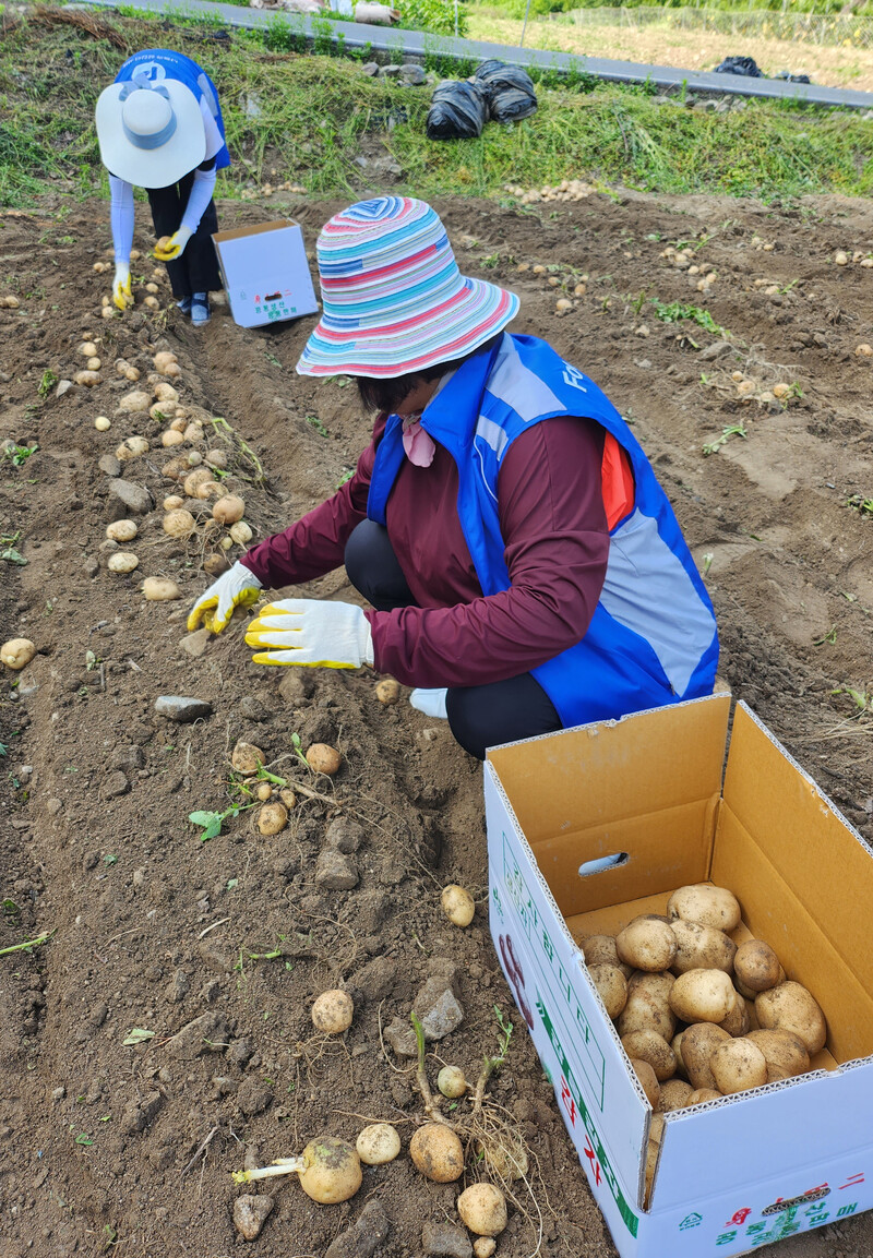 In order to offer helping hands to short-handed farming villages with several other volunteers, I visited a potato patch in Goesan, North Chungcheong Province. At the patch, I could still smell the clean, fresh early morning air.