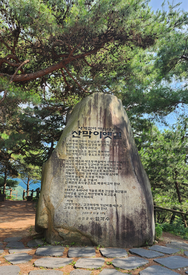 옛길 입구엔 기념비가 있다. 한반도 정중앙에 위치한 괴산댐에 대한 안내였다. 1957년 우리나라 기술로는 최초로 건설된 괴산댐의 역사성을 알리는 기념비다.