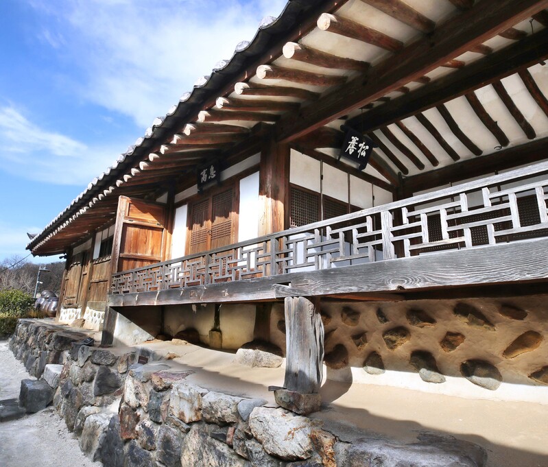 Songcheom (National Folk Cultural Heritage) is a large family home of the Sons in Yangdong Village, built by Son So (1433-1484), who was an important figure in the village. Son So was the father of Son Jung-don. Upon entering the house and looking to the right, a fragrant tree with abundant branches stands. Known as the 'Yangdong Fragrant Tree,' it is said to be over 500 years old. Visitors' attention was drawn to the fragrant tree, while on the left, sturdy stone pillars were visible. Walking further, we found well-arranged stone platforms at the back.