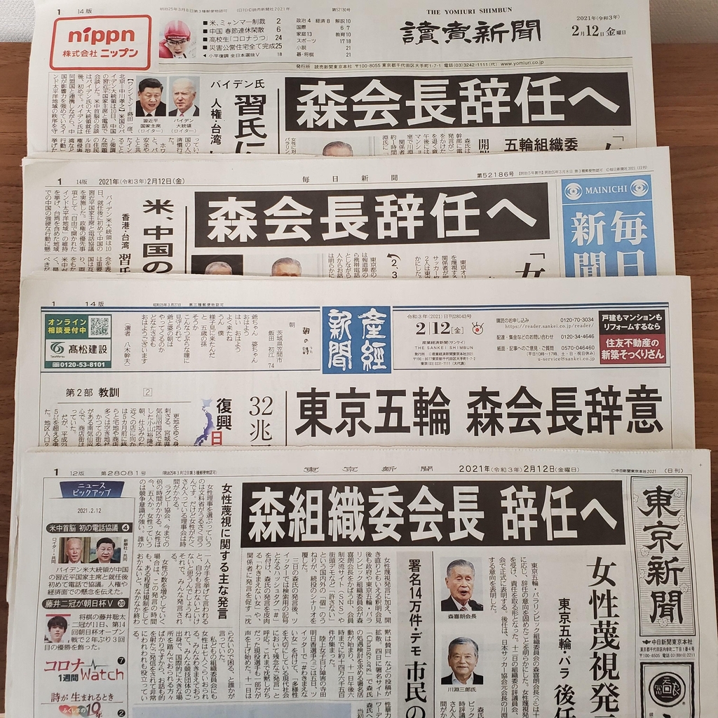 | ▲ 모리 회장 사임 보도한 일본 신문들 (도쿄=연합뉴스) 김호준 특파원 = 12일 일본 주요 조간 신문들은 모리 요시로 도쿄올림픽·패럴림픽 조직위원회 회장의 사임 소식을 1면 톱 기사로 게재했다. 2020.02.12 |