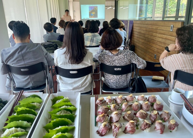 | ▲ 미술관 강의와 준비된 음식. Do Gwang-hwan, principal of Yonhap News Agency's Travel Academy, delivers special lecture on art at Ahn Sang Chul Museum. |