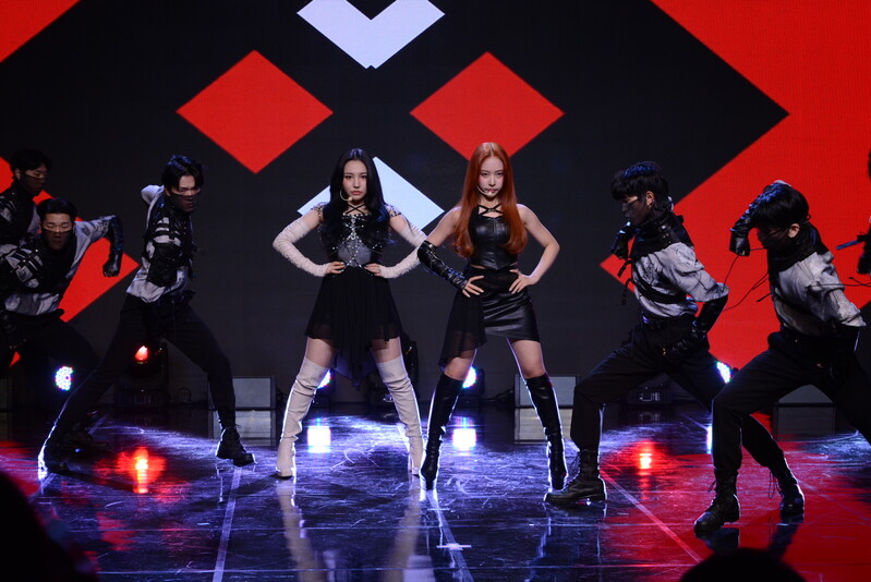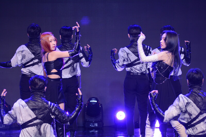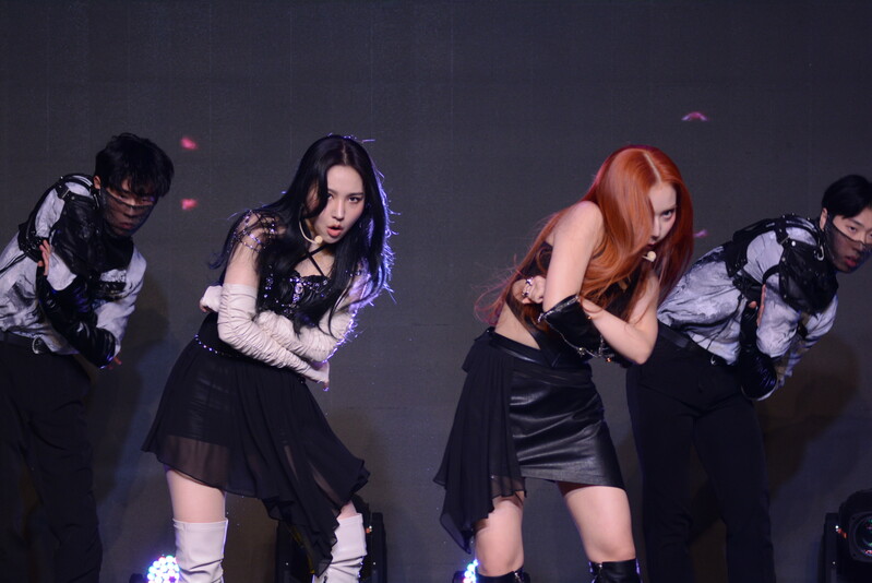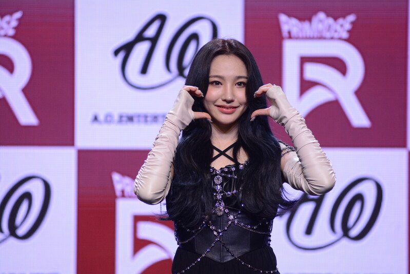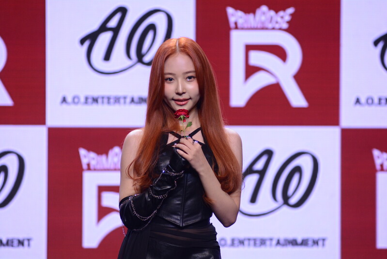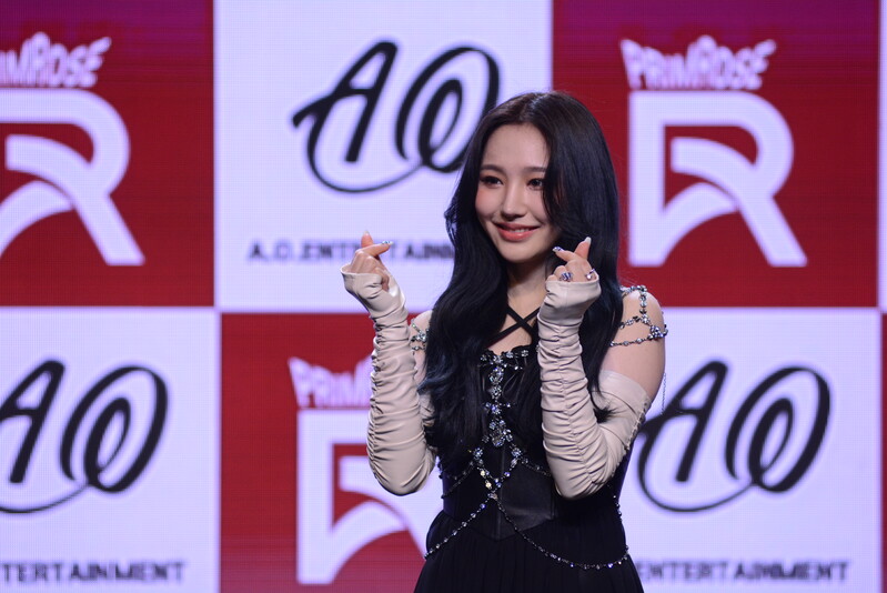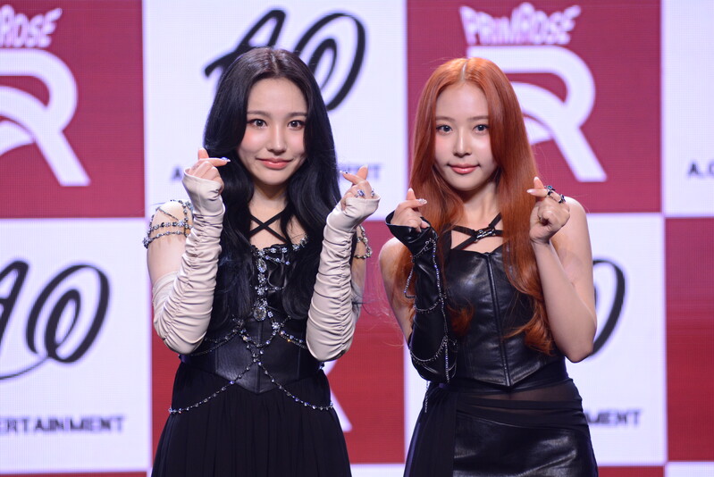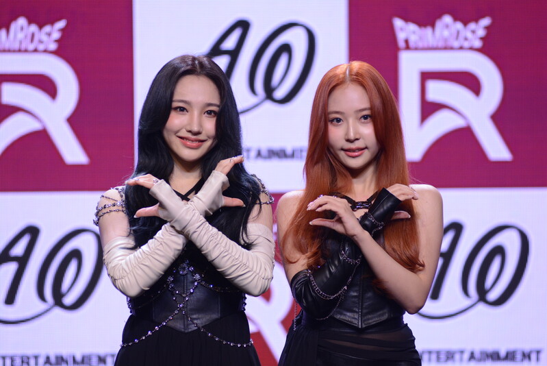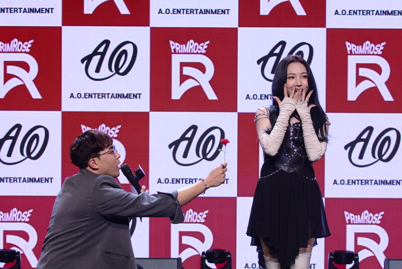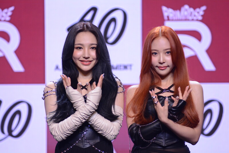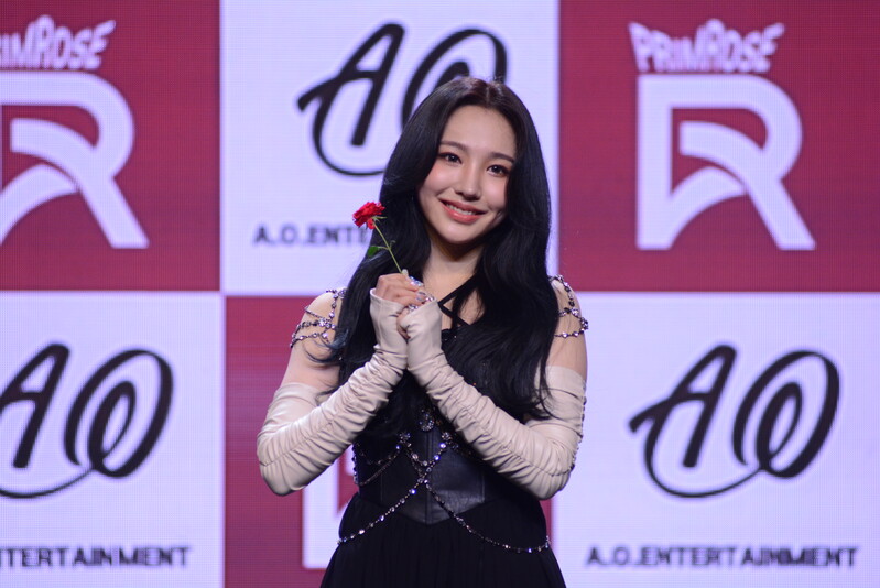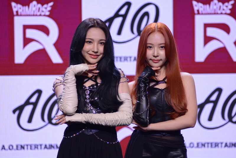 These photos, taken during the debut media showcase of K-pop girl group Prim Rose, show members Yeum and Ruby posing for their individual, group photos, answering questions and performing their title track "Primrose."