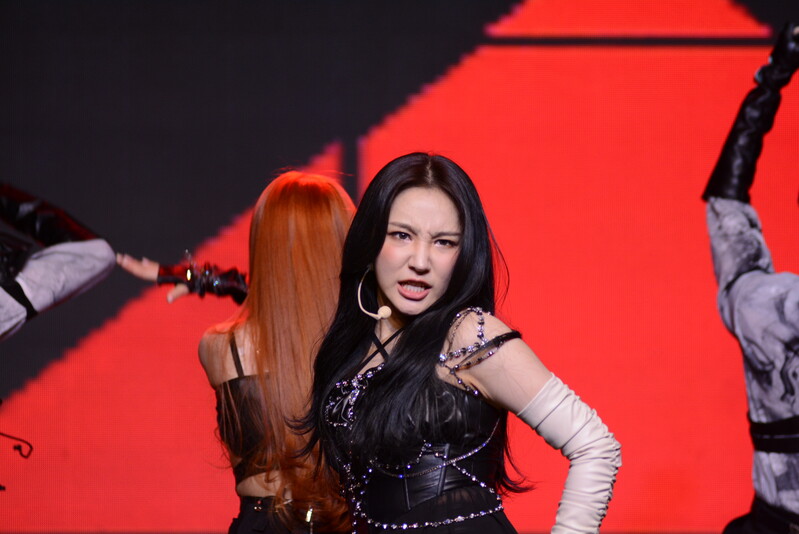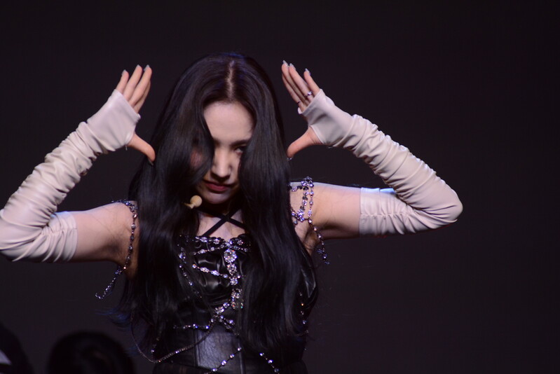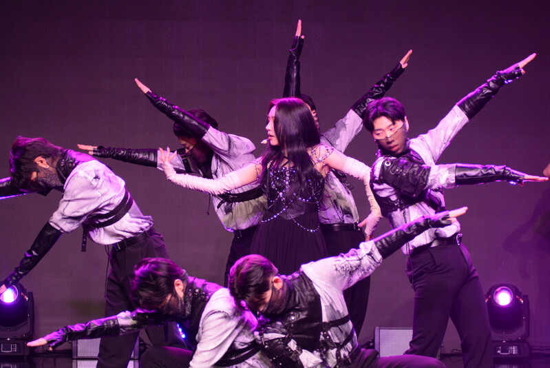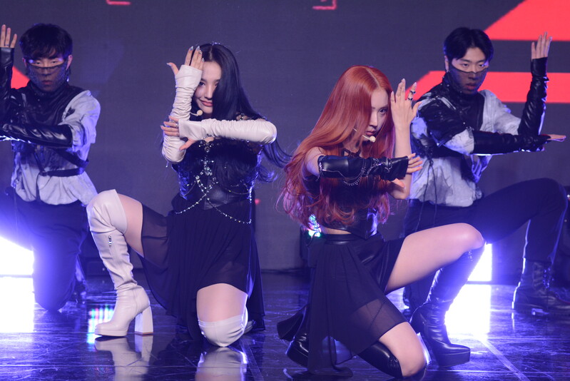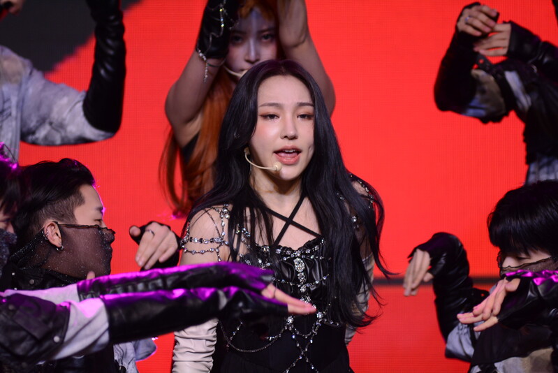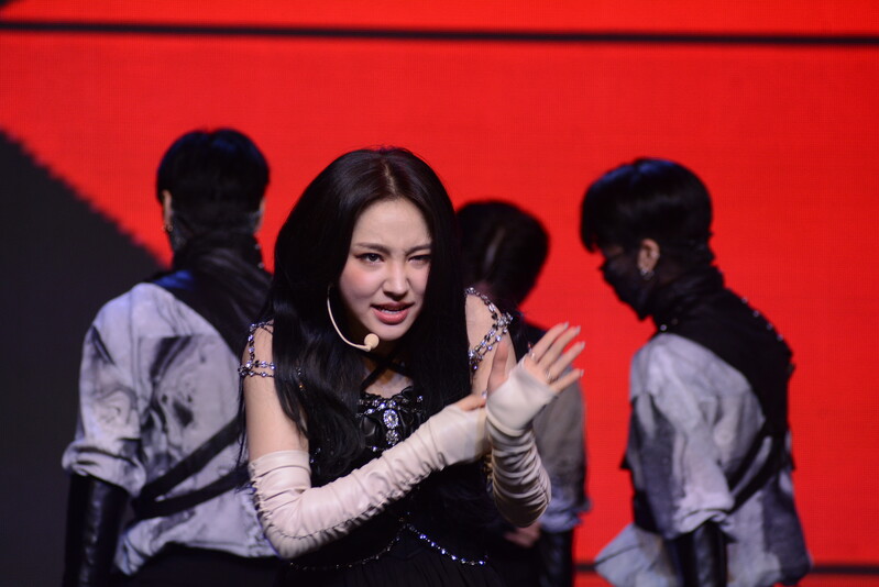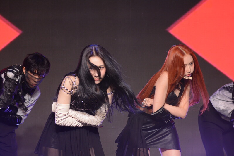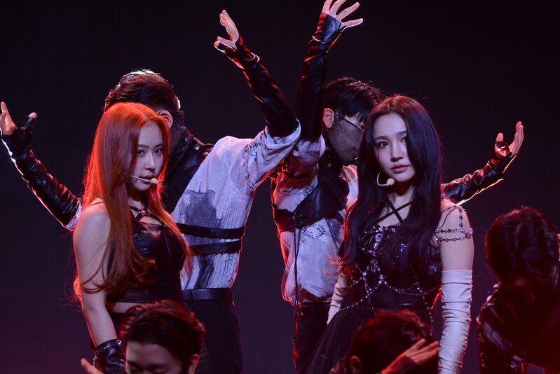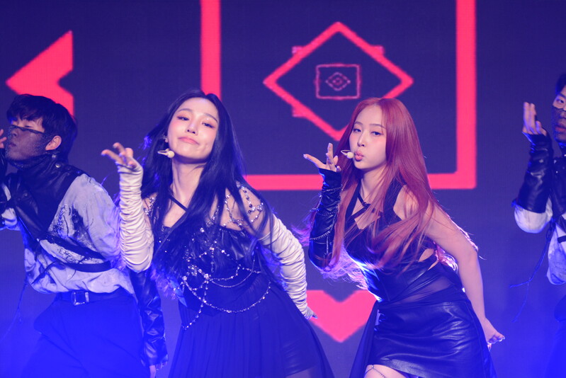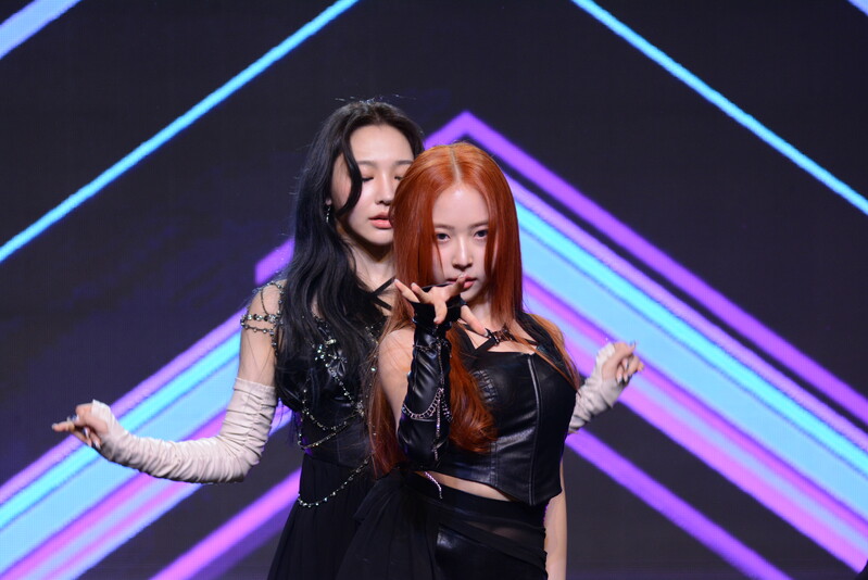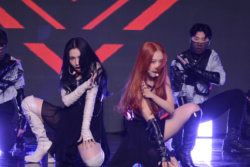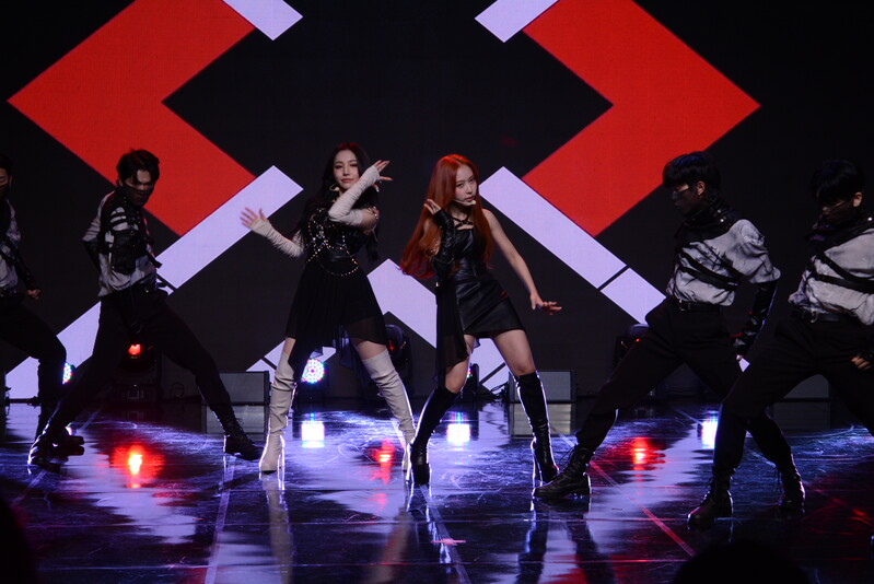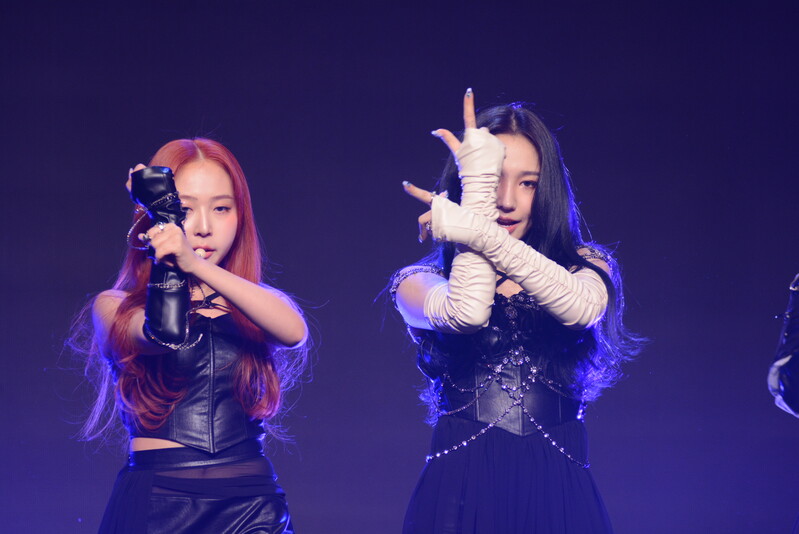These photos, taken during the debut media showcase of K-pop girl group Prim Rose, show members Yeum and Ruby posing for their individual, group photos, answering questions and performing their title track "Primrose."