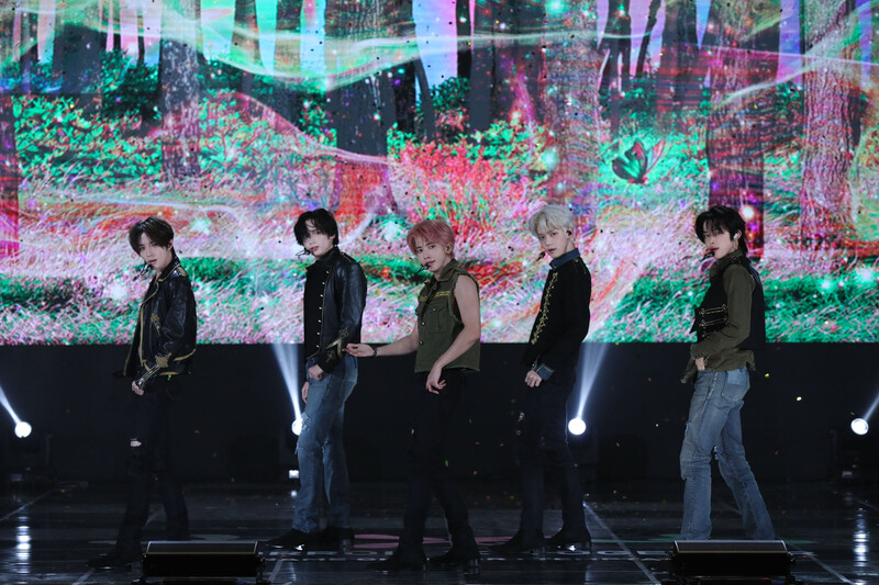 These photos, provided by Big Hit Music, show the members of TOMORROW X TOGETHER -- Byeomgyu, Soobin, Taehyun, Yeonjun, and Heuning Kai -- performing the title track "Sugar Rush Ride" at the media showcase of their 5th mini album "TEMPTATION."