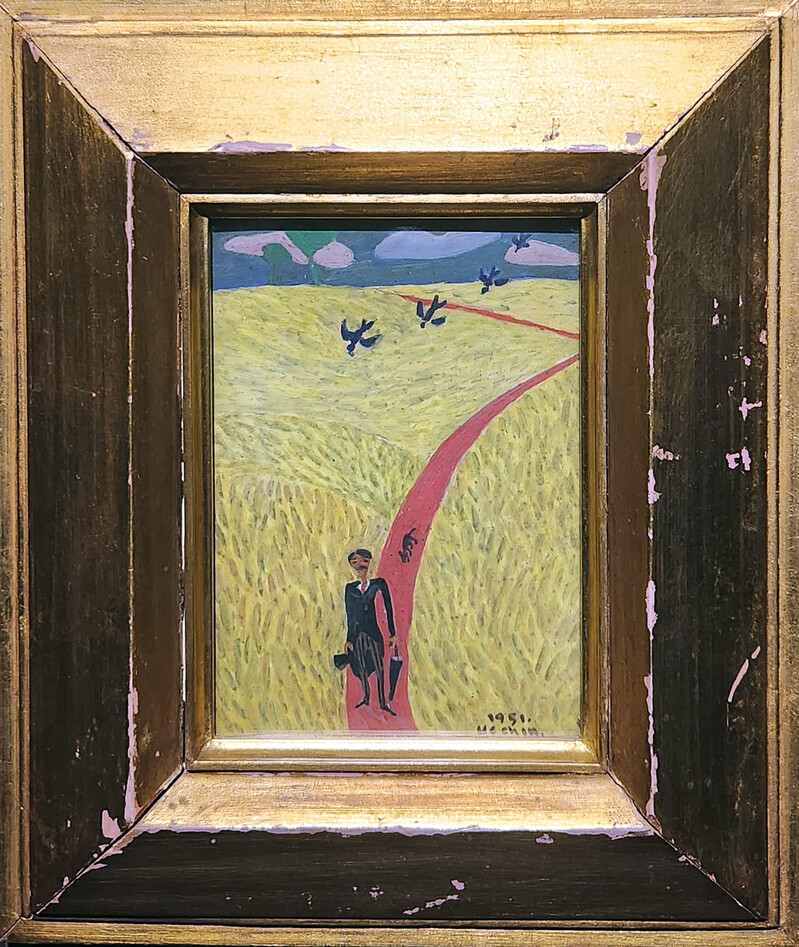 Chang Ucchin painted his self-portrait amidst the chaos of the Korean War. Several floating clouds, two trees, a winding red path, four birds flying towards him, and a vibrant yellow golden field evoke not just the abundance but also the flamboyance.