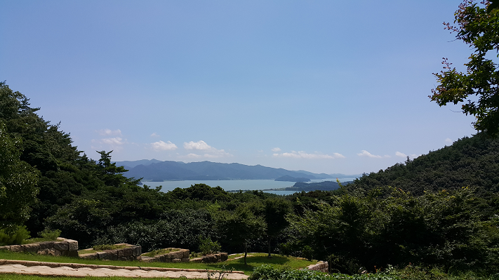 As I hiked up and down the trail behind Gangjin County Office, I saw Goseong Temple at the end of the paved road. In the grand yard, three-roomed Daeungjeon stands against the mountain with a bell tower in the front. Gazing the south from the yard's end, I was able to see the blurry sight of Gangjinman Bay, Jujak Mountain, and Deokryong Mountain. Under the mountain, vast field ran on one side and Gangjinman Bay on the other.